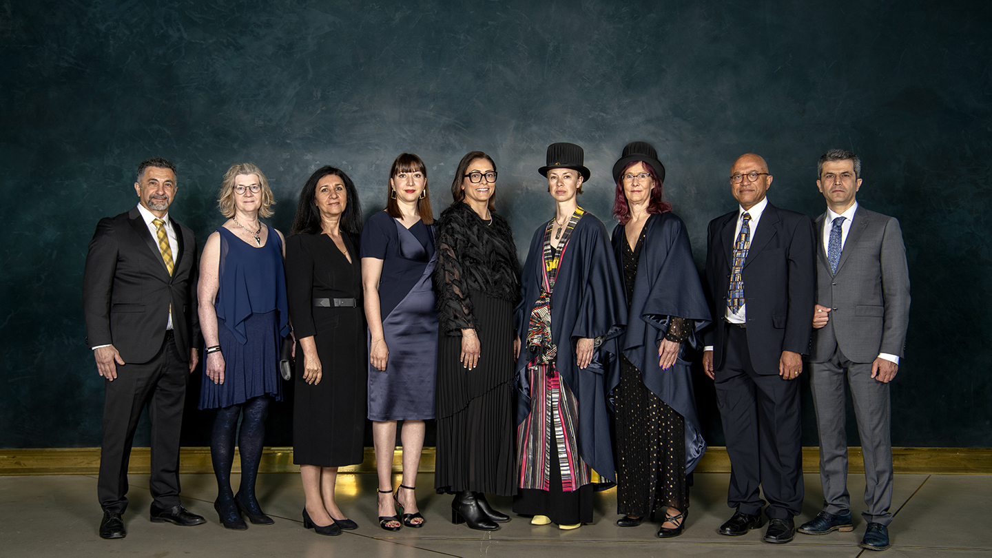 Hamid Movaffaghi, Marita Cronqvist, Nasrine Olsson, Marjan Kooroshnia, Firouze Pourmand Hilmersson, Hanna Landin (Chair of the Artistic Research and Education Board), Eva Gustafsson (Chair of the Research and Education Board), Getahun Yacob Abraham, Fardin Saedpanah. Photo: Anna Sigge
