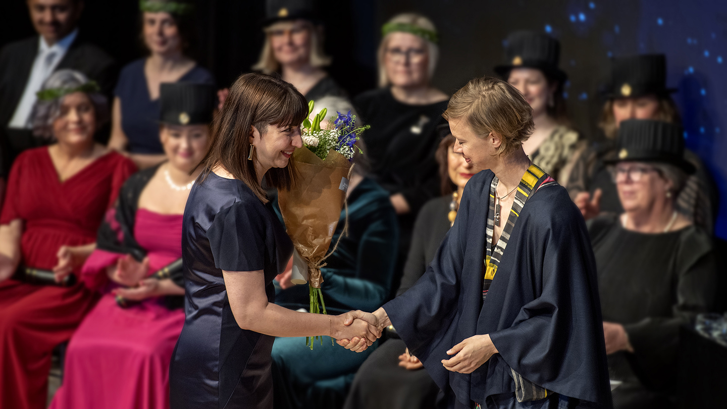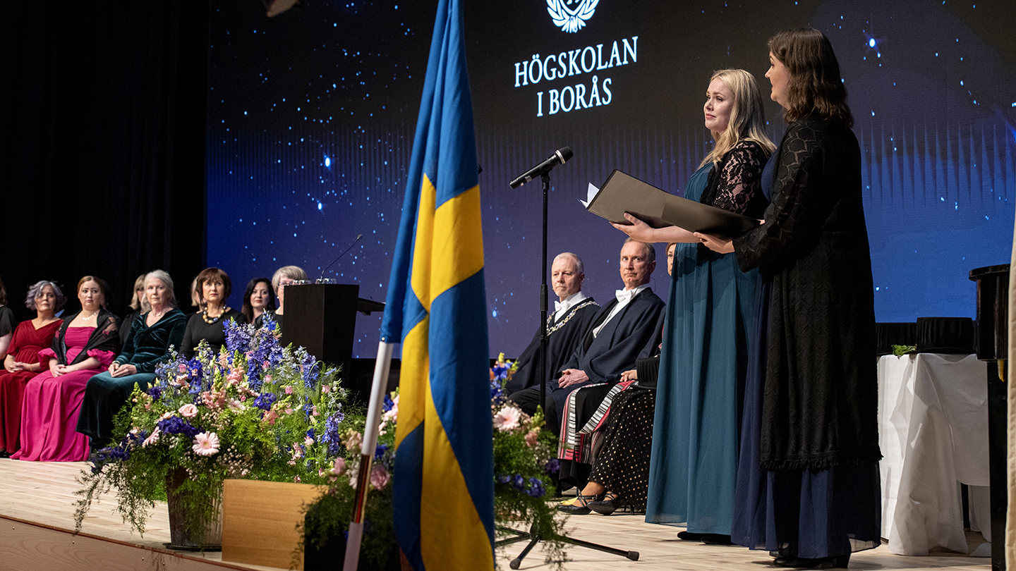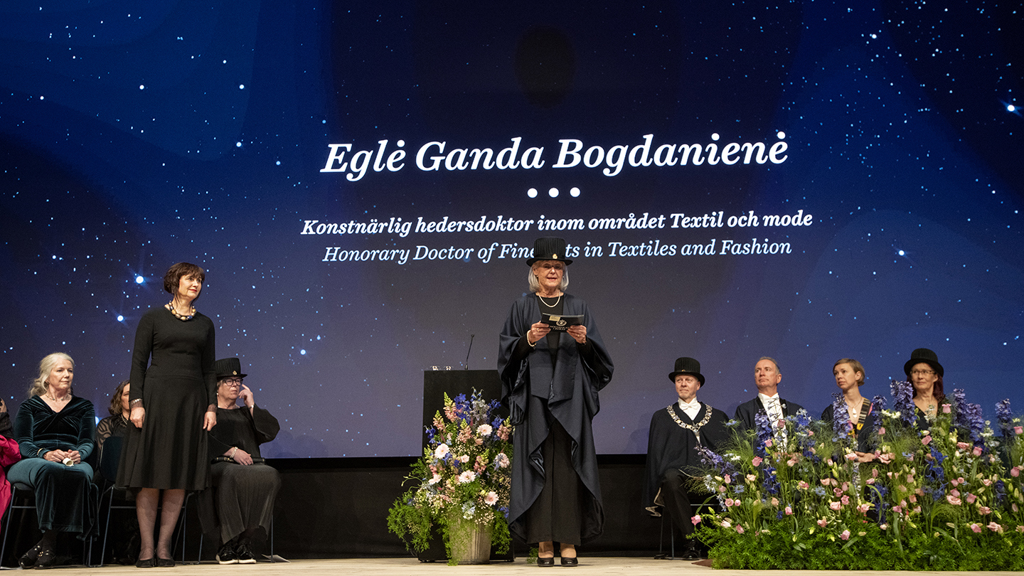 A total of 13 new doctorate recipients and two honorary doctors were promoted, one professor was installed. During the ceremony, the university also presented achievement awards to recipients of the merit docent. Speakers were Vice-Chancellor Mats Tinnsten, Professor Elisabeth Lindberg, Honorary Doctor Anne Ludvigson, Chair of the Artistic Research and Education Board Hanna Landin and the Student Union's representative Amanda Johansson. Pro-Vice-Chancellor Kim Bolton and student representative Natascha Dybeck awarded the Pedagogical Prize to Malin Utter.