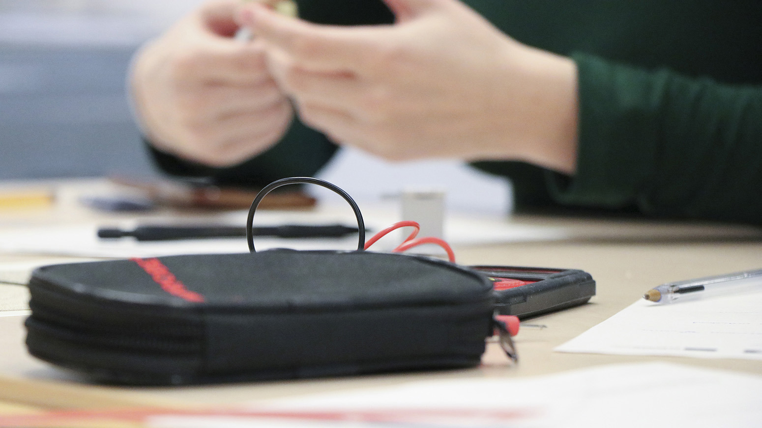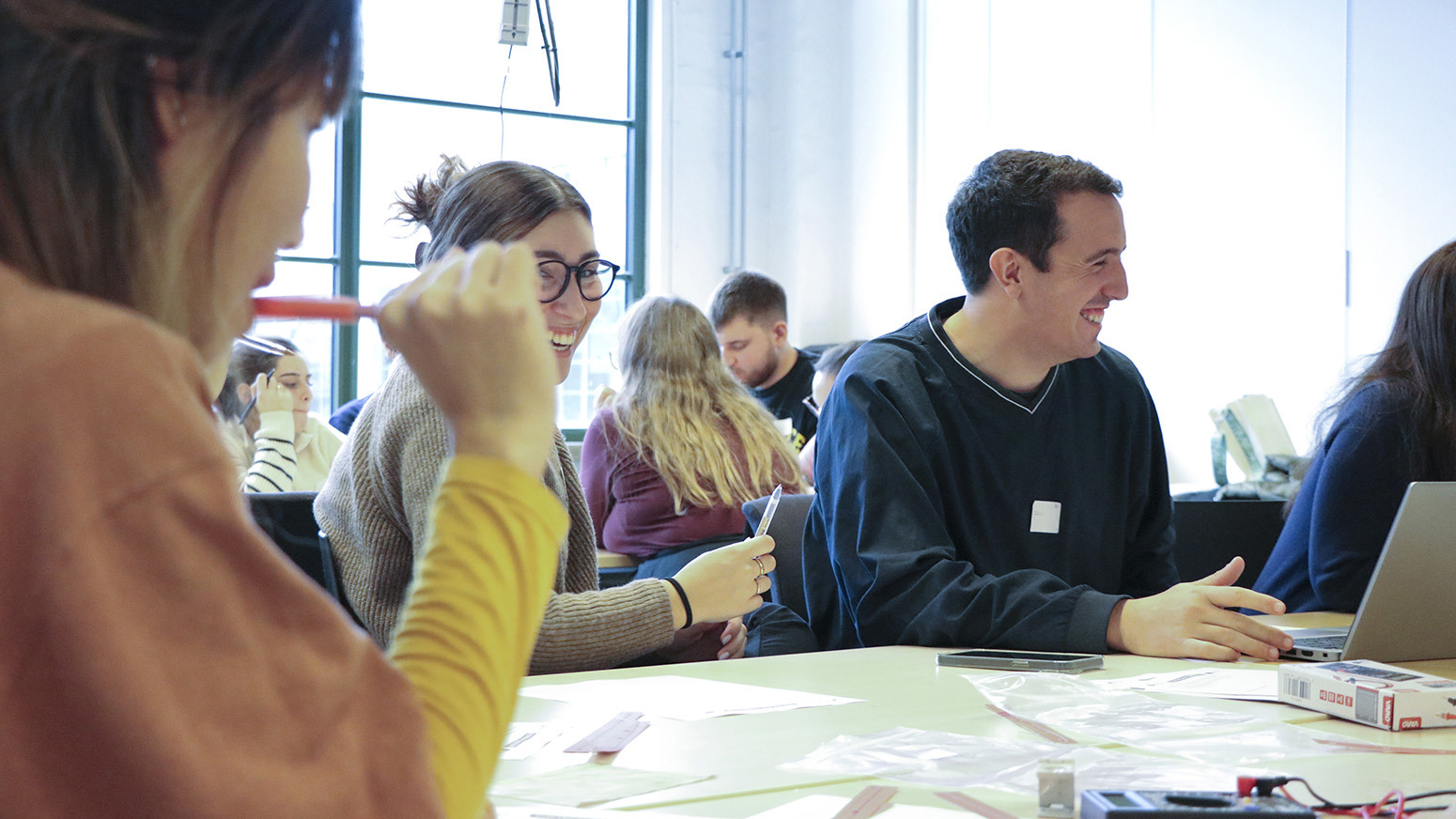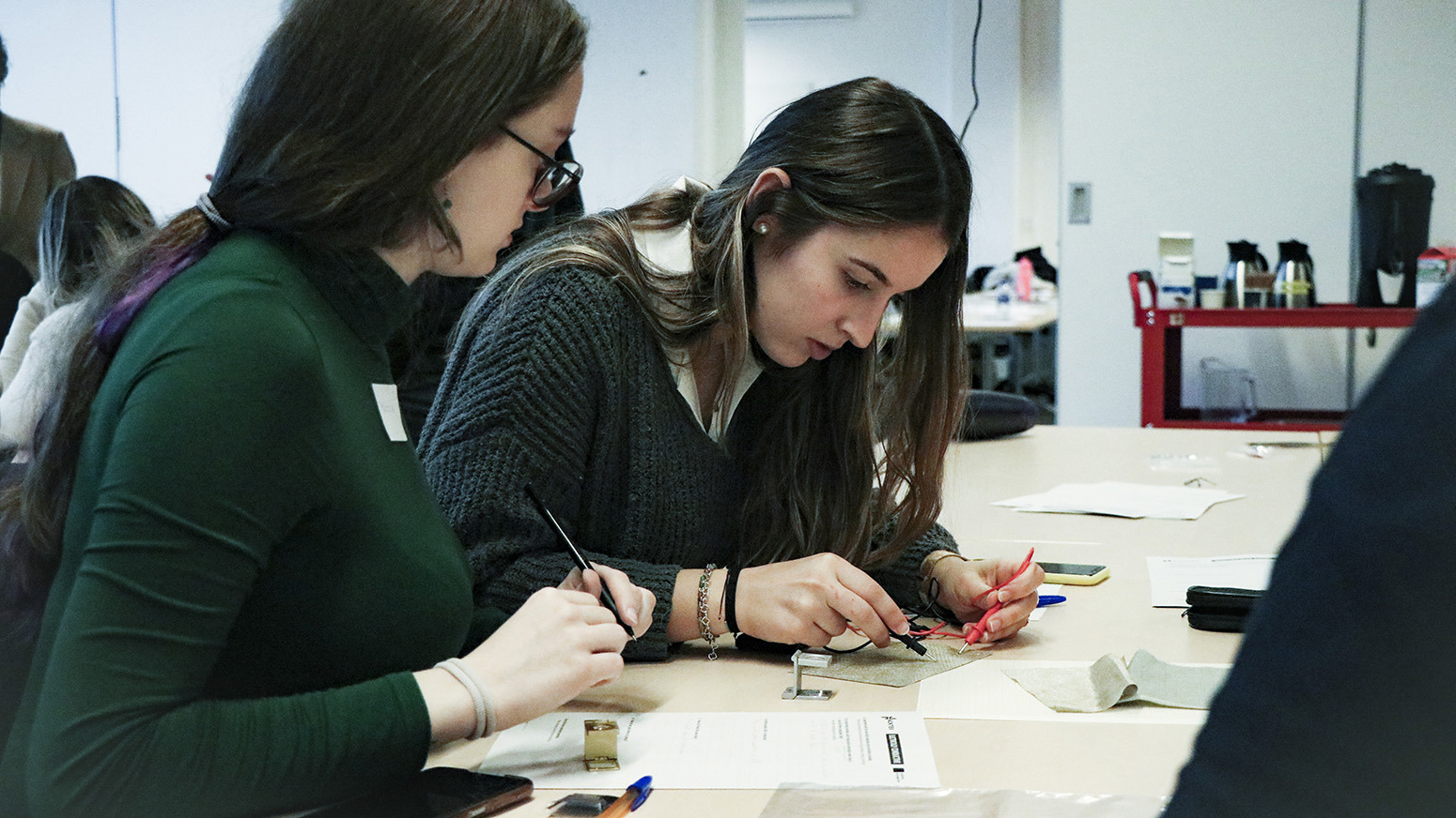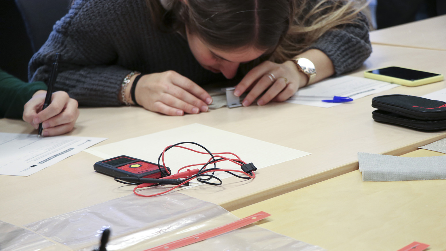 In a classroom at the Swedish School of Textiles, we met students Diamantis Polychronis from the University of West Attica, Joan Sánchez from the Universitat Politècnica de Catalunya, and Denisa-Ramona Fraseniuc from the Gheorghe Asachi Technical University of Iaşi. With one day left of the camp, there is a buoyant atmosphere among them. They joke and finish each other’s sentences as they talk about their experience in Sweden: