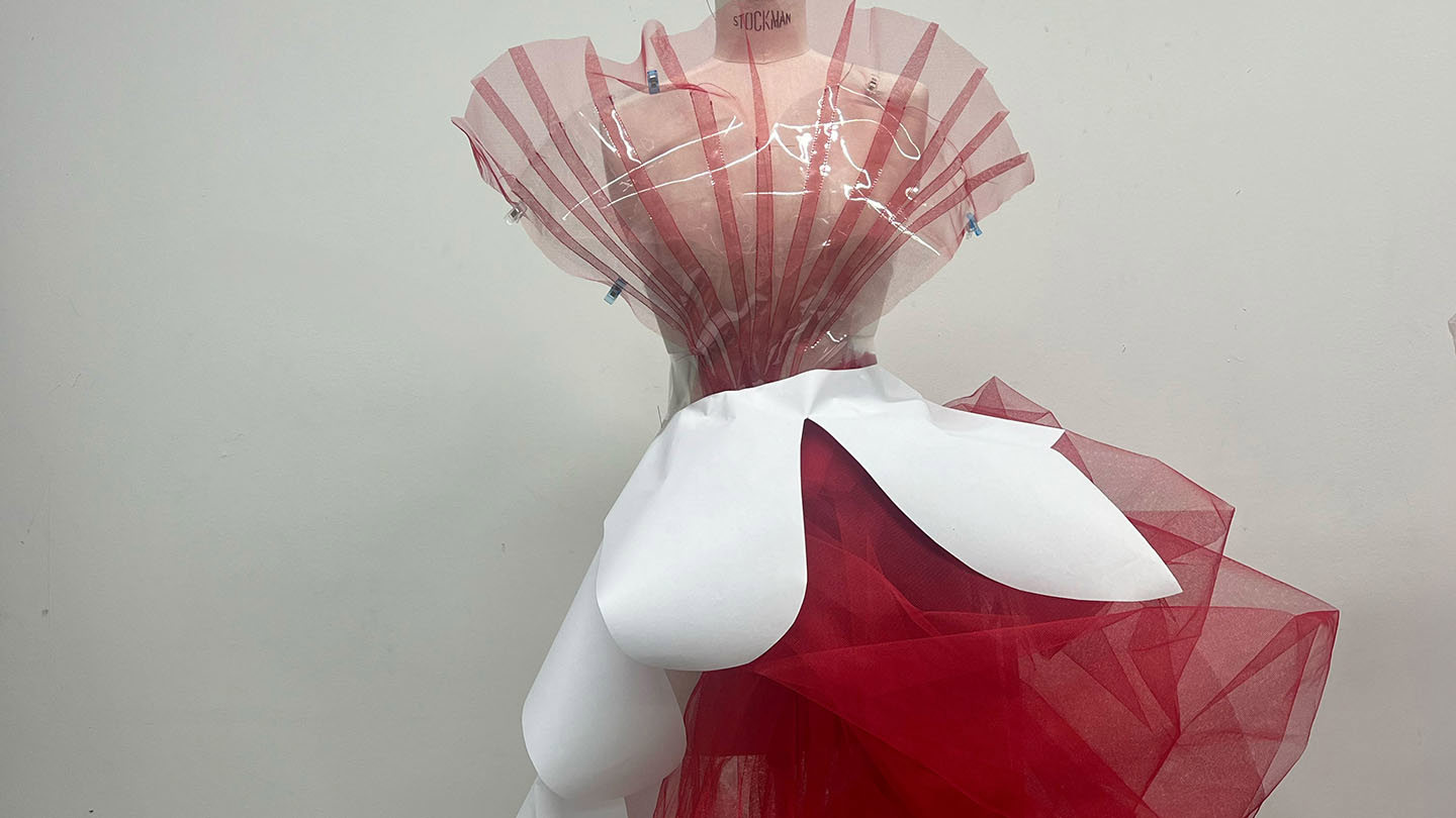 In the showcase, the students are presenting their mid-term collections, where each student have chosen to explore a specific technique. Based on this, they have created three unique looks.