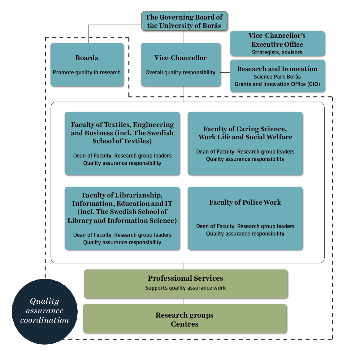 Vice-Chancellor - Under the vice-chancellor are staff functions and a line organization consisting of four faculties and the professional services. The faculties and professional services support are in turn organised into a number of underlying departments and units. Each faculty is responsible for the quality work performed within its educational activities. The professional services supports the quality work for education. The vice-chancellor has the overall quality responsibility at the university.