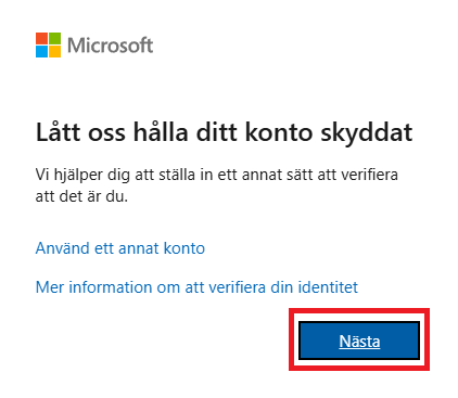 - If your account is ready to configure multi‑factor authentication, a window will appear with the text "Låt oss hålla ditt konto skyddat" Click “Nästa”.