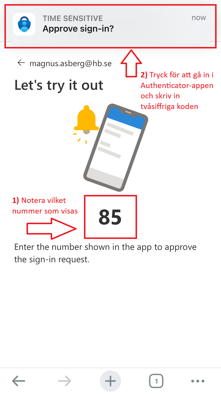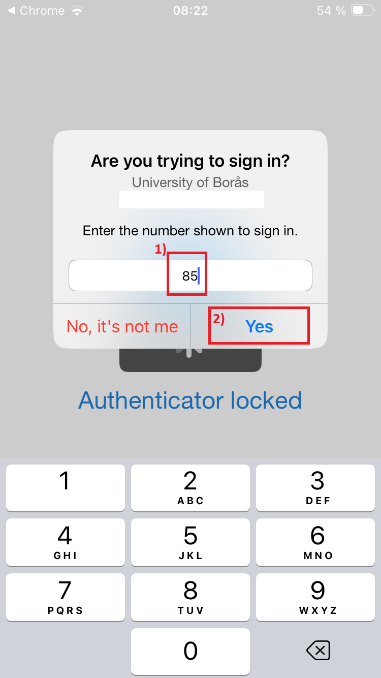 - A two‑digit code will appear on your computer. Enter the code in the Microsoft Authenticator app and tap “Yes.”