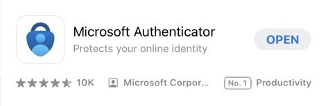 Go to the App Store (iPhone) or Google Play (Android) and search for Microsoft Authenticator to install it. Please ensure that you select the correct app (as shown in the image)