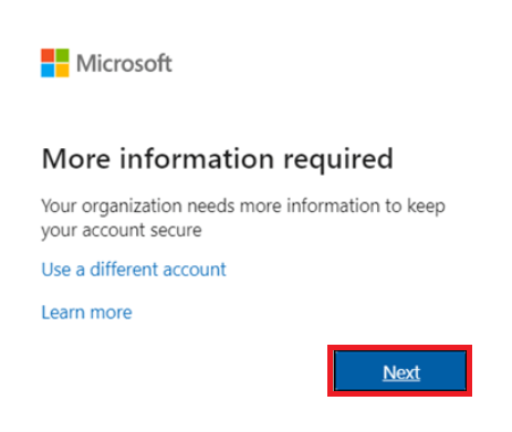 - If your account is ready to configure Multifactor Authentication a window with "More information required" will show up. Click Next.