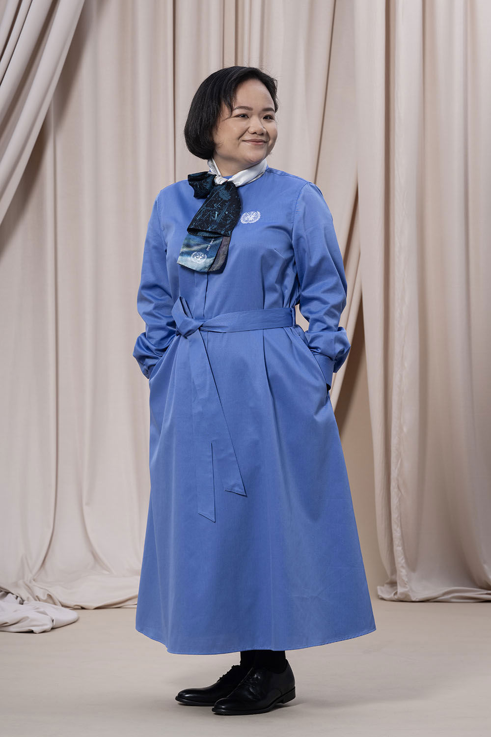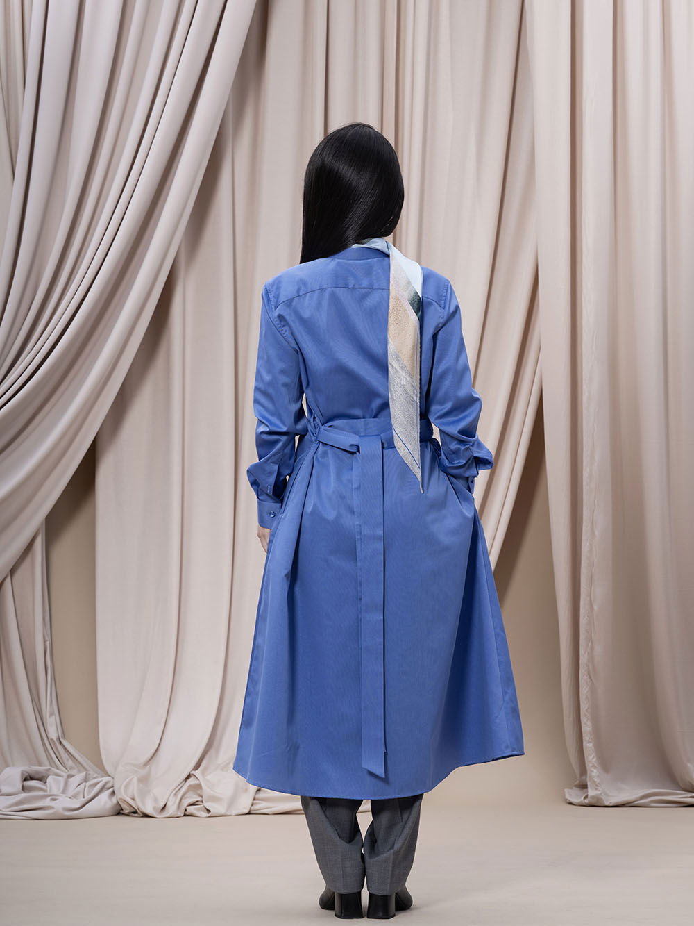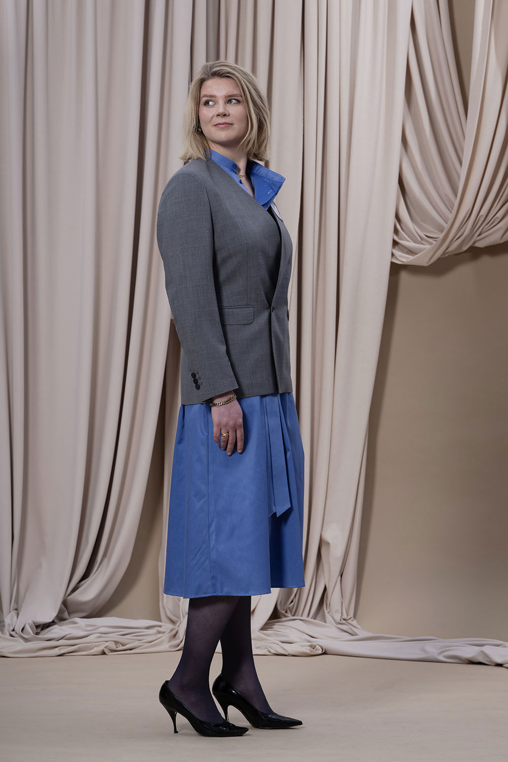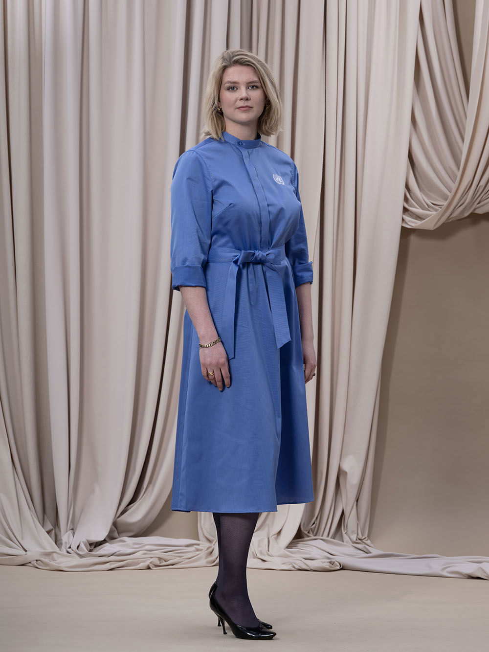 The dress has practical pockets in the side seams. The belting is a system of three loops at the sides, in which the tie-belt can be placed at three different heights depending on the user's height and styling wishes. This is a special feature that allows the garment to be worn in different ways and adapted to different body shapes.