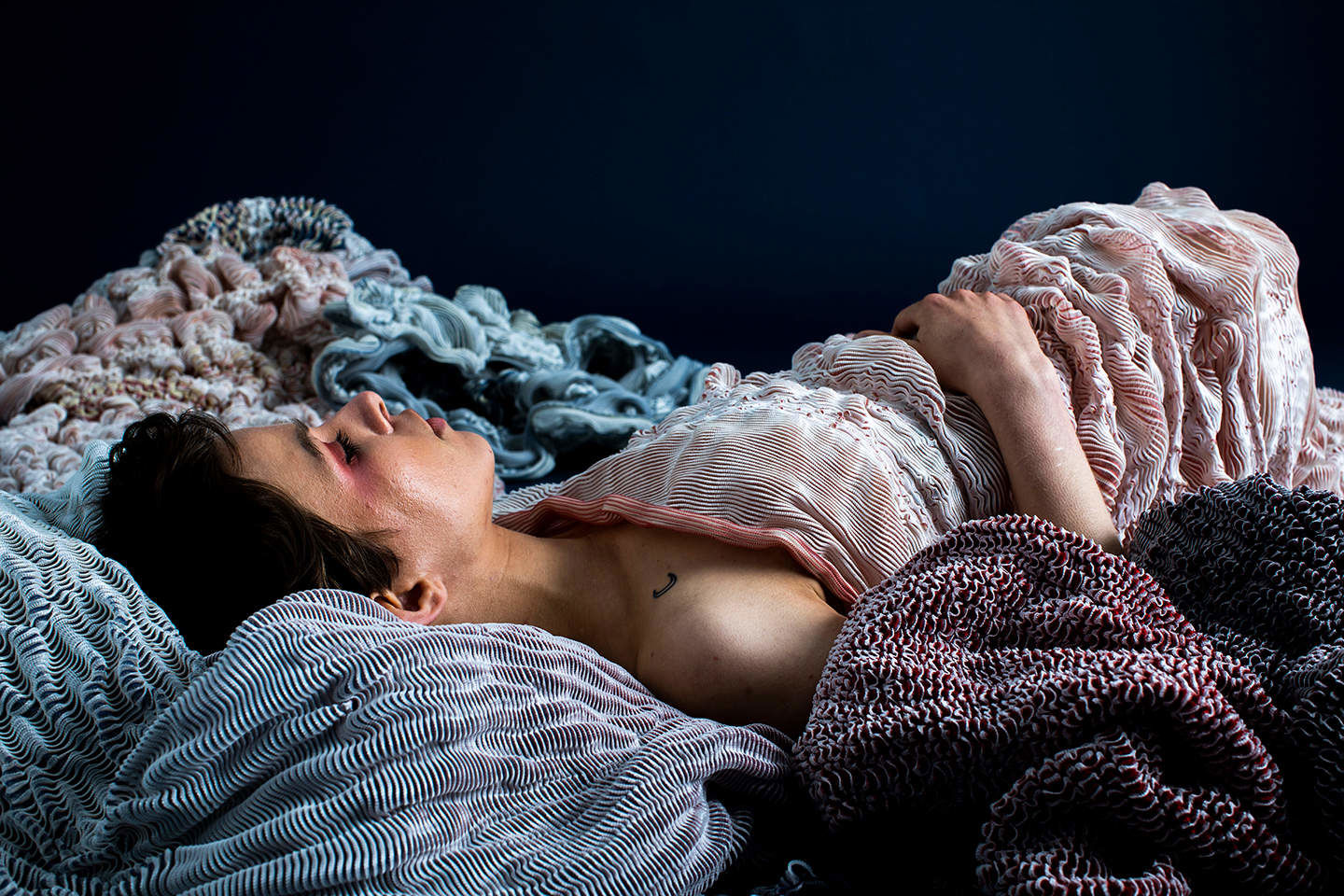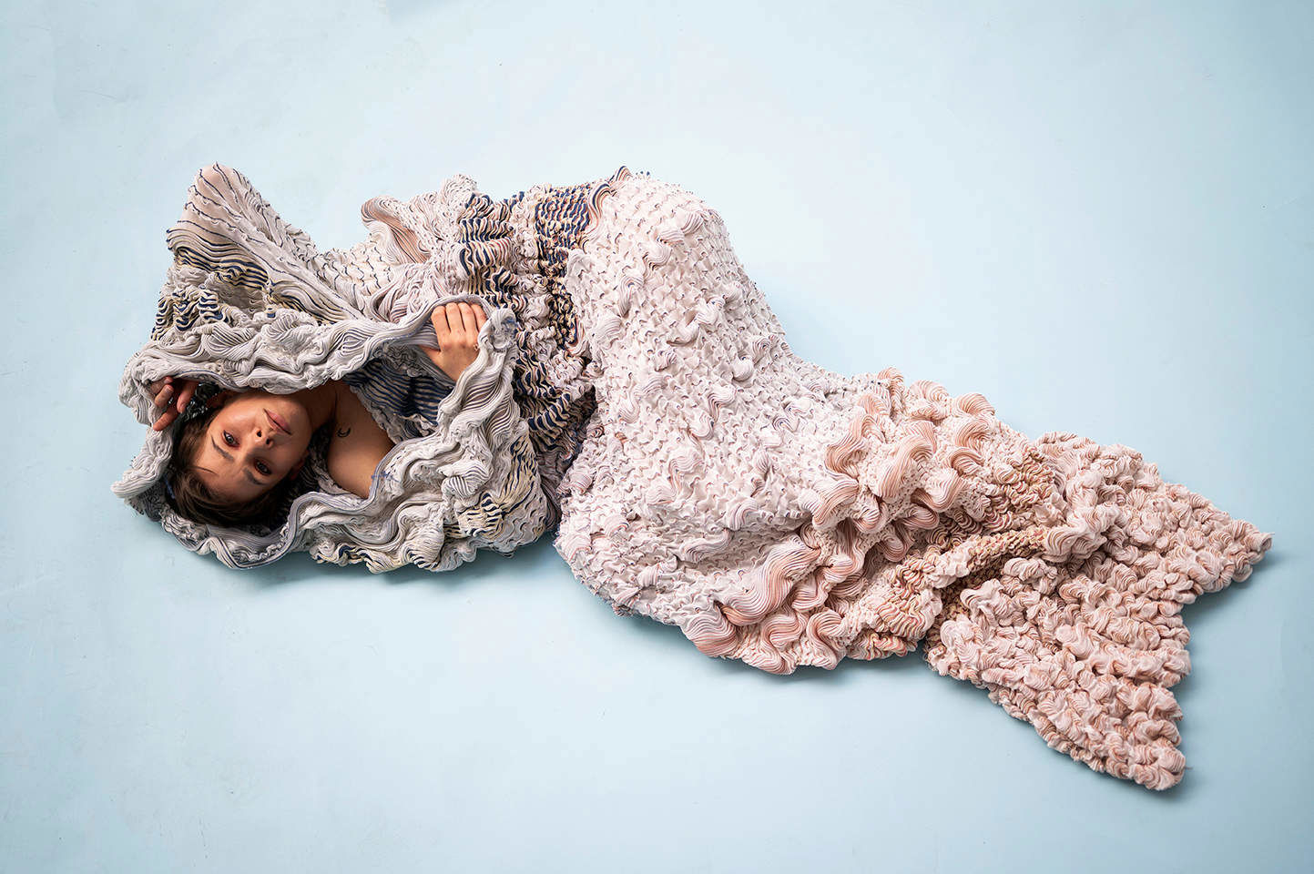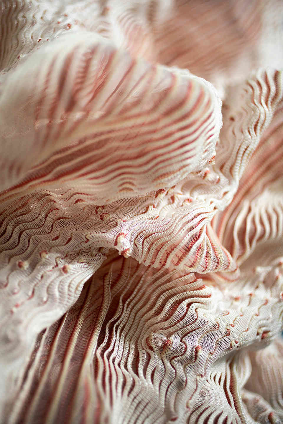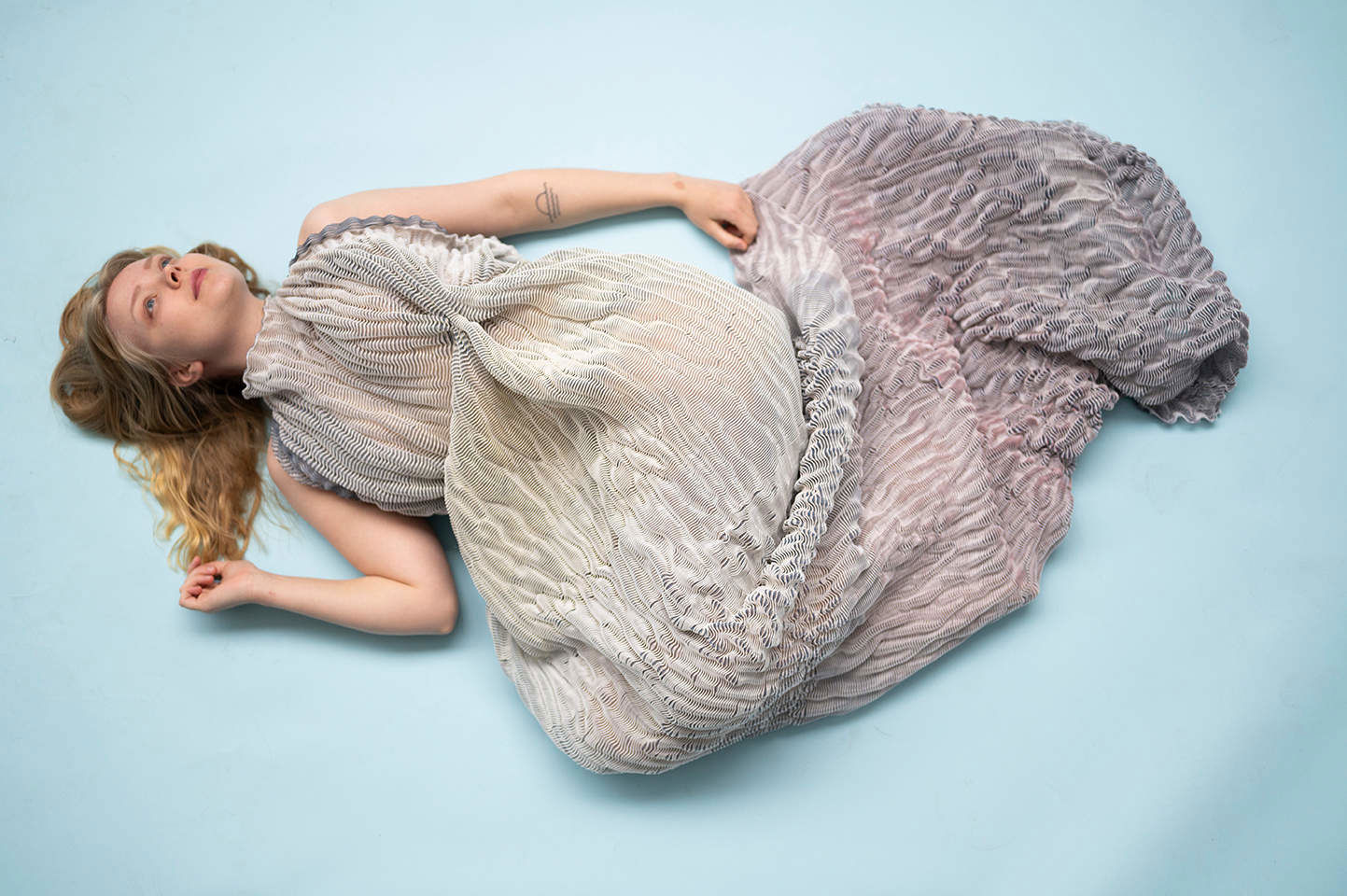 This work places itself in the field of knitted textile design and the context of body and interior. The primary motive is to investigate the tactile and visual properties of oysters and pearls, inspired by Botticelli’s painting The birth of Venus. The aim is to explore free-flowing and texture through knitted three-dimensional textile surfaces.