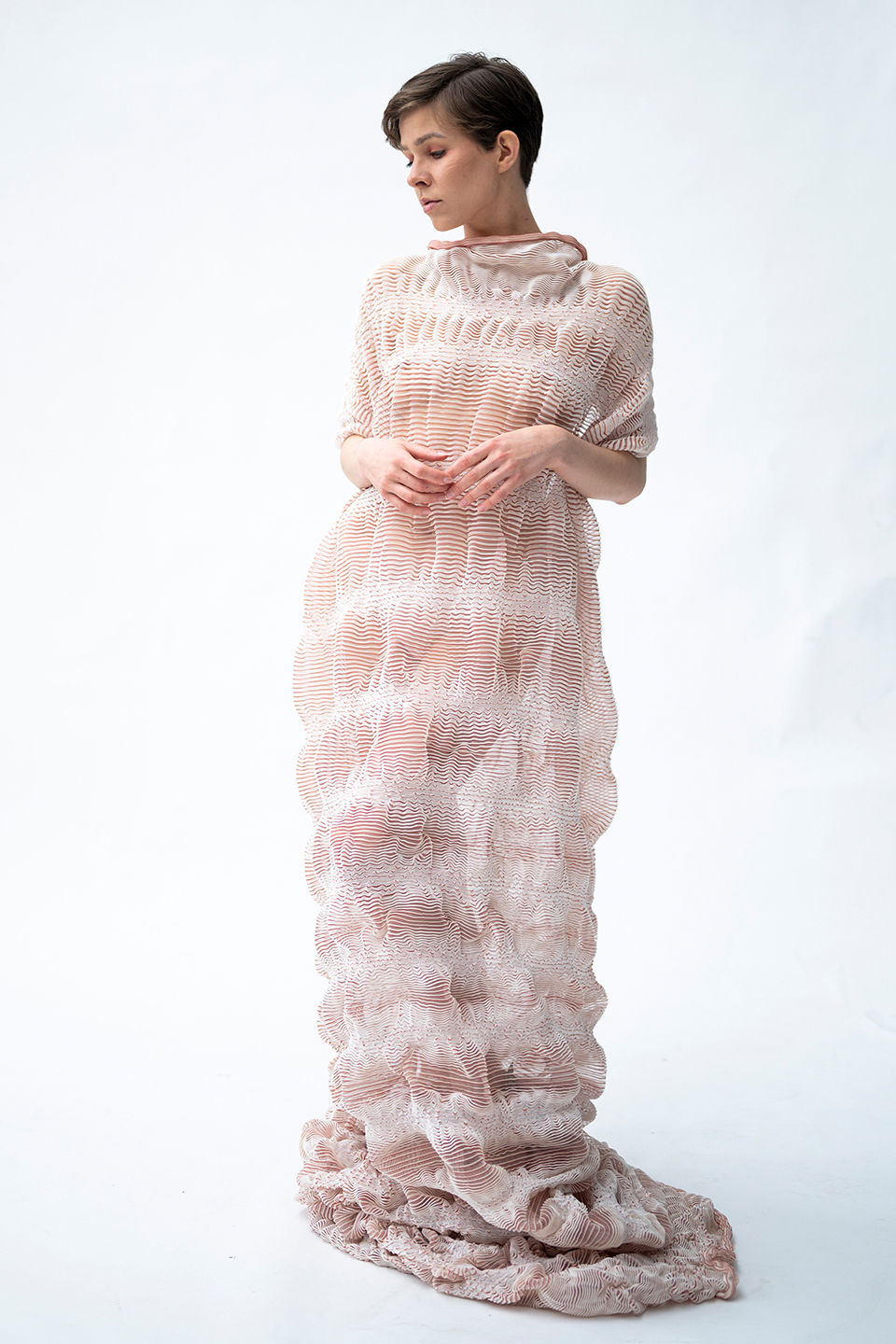 This work investigates the potential of using circle knit machines, commonly used in fast fashion for bulk production, as a tool for handicraft and higher art forms. The final collection pushes the conversation regarding the future uses of the knitting machines and investigates how rigid objects can be expressed through the flexible structure.