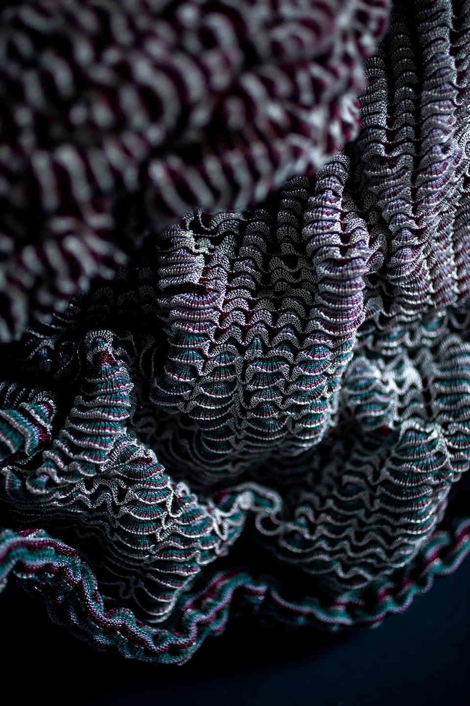 Material and colour choices have been made based on the source of inspiration, the oyster, and investigated on industrial circle knit and flat knit machines. The circle knits expression has been explored from a hand knitting perspective, using the manual elements to push the machine’s technique to design new expressions. The result of the project is a collection that has four suggestions for a knitted, three-dimensional surface, each inspired and developed from one specific part of the oyster; the shell, the nacre, the flesh, and the pearl.
