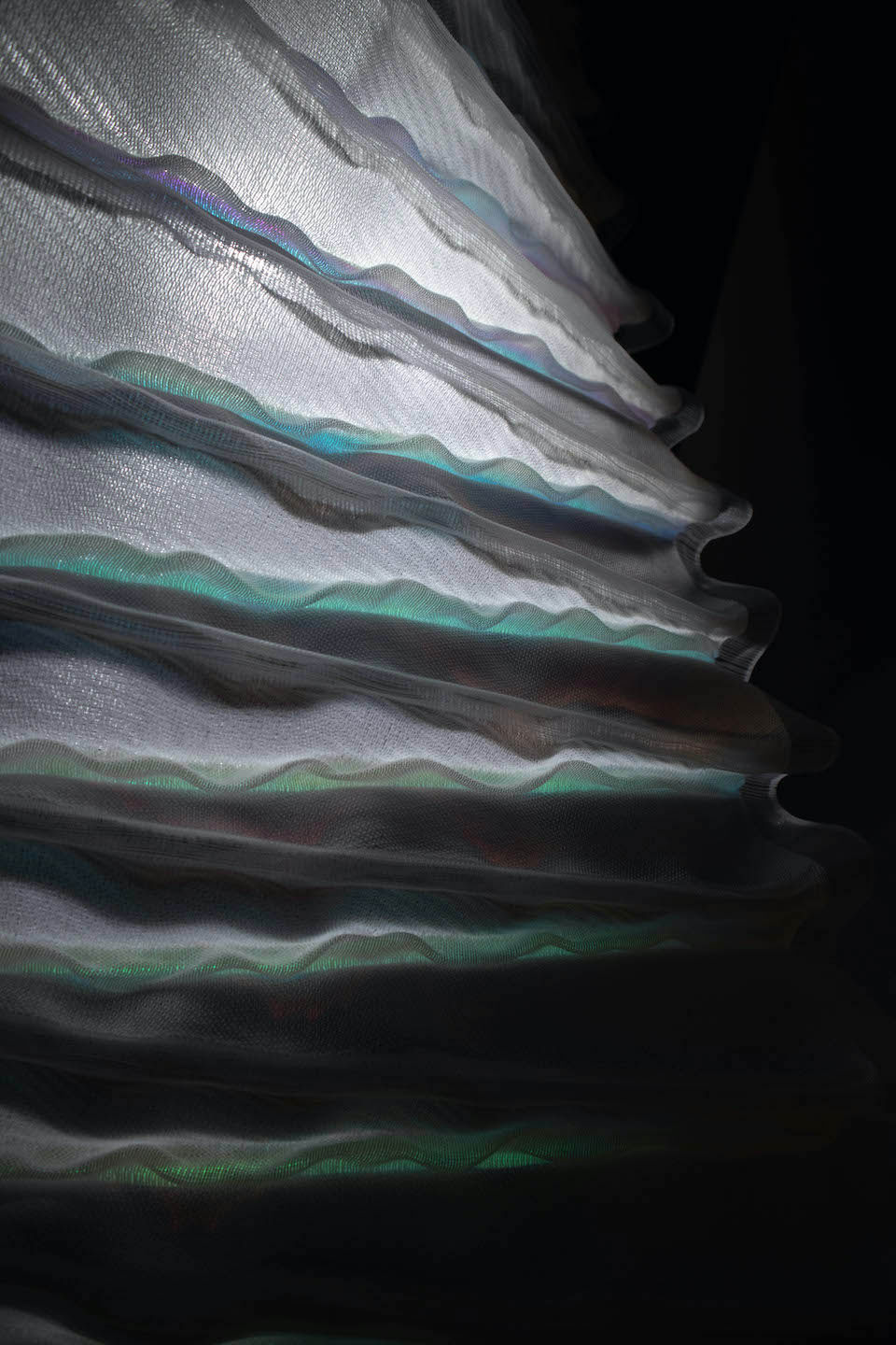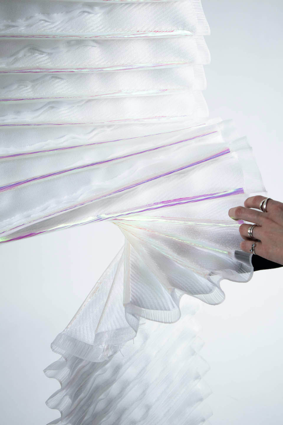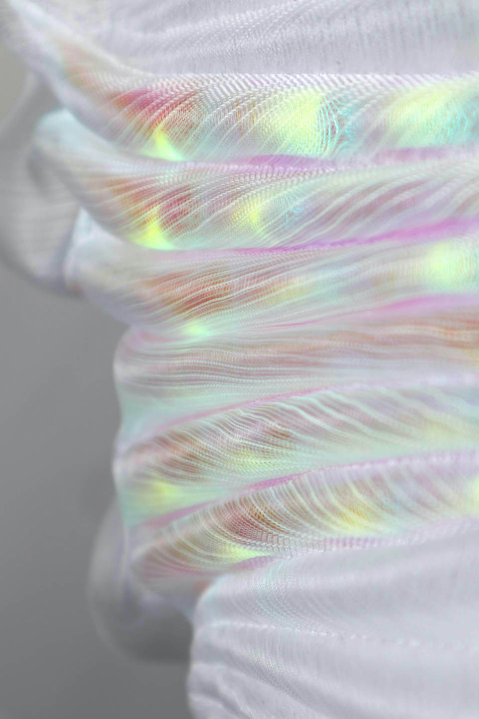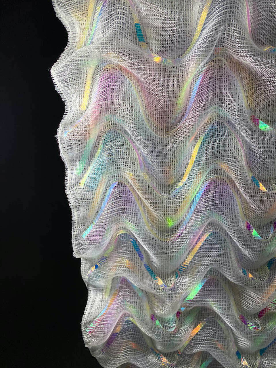 The project and methods used have been developed through experimental design research focused on designing a space in the woven material for the dichroic filter to exist and showcase its potential as a colourant in a woven design.