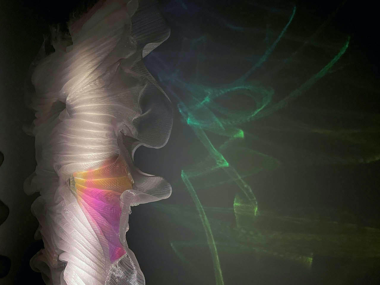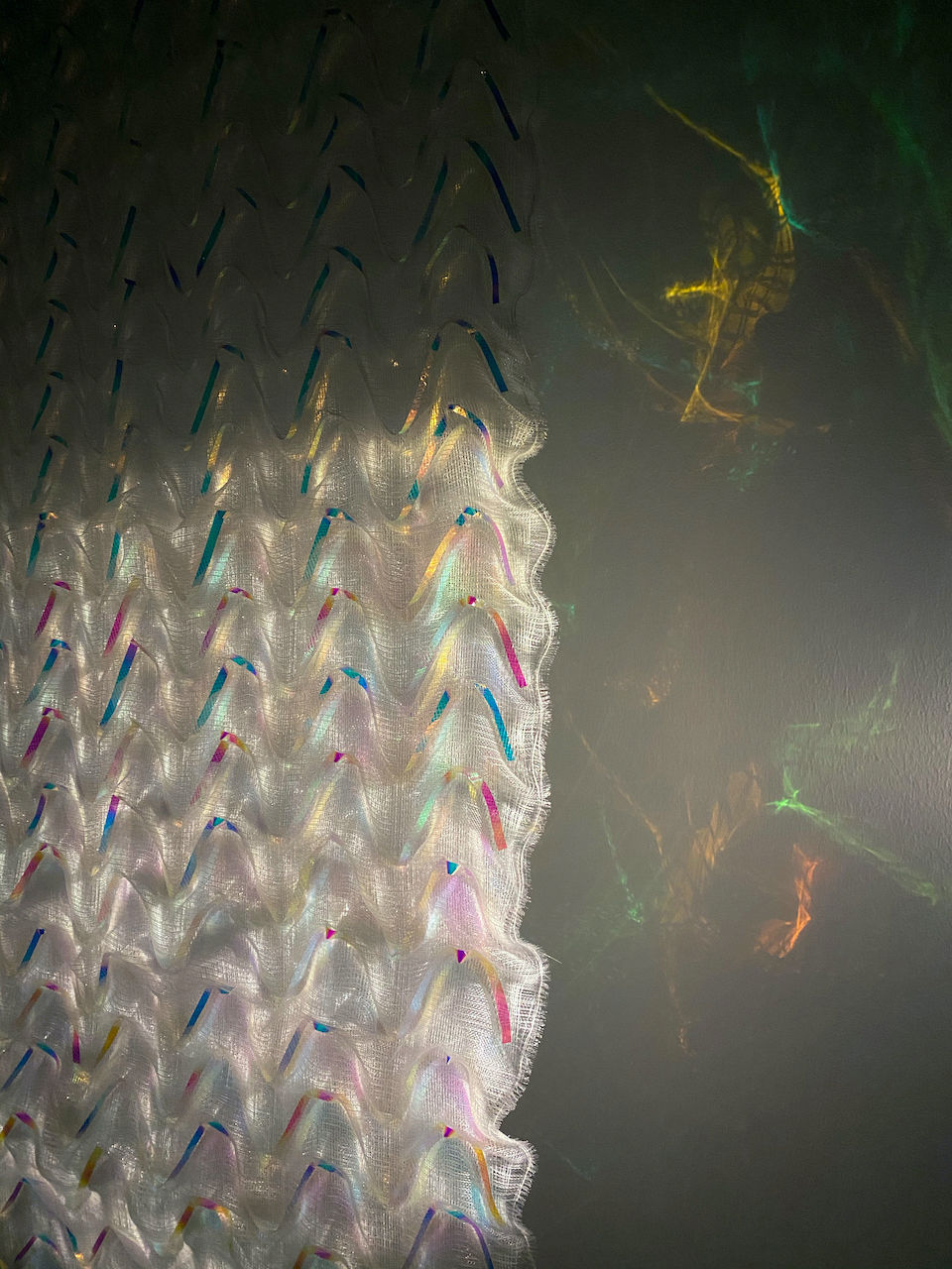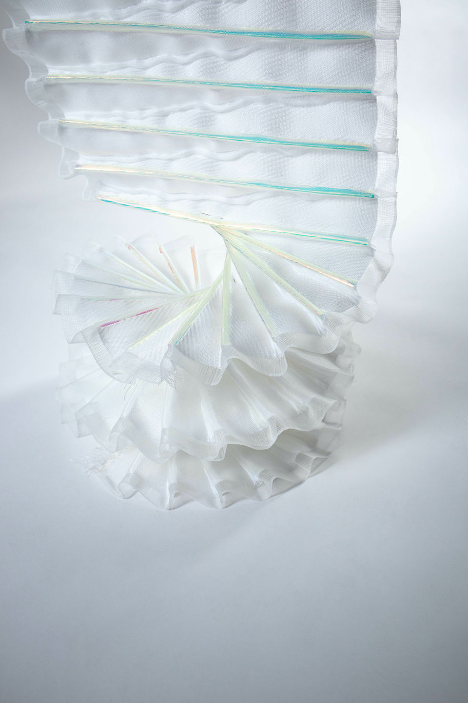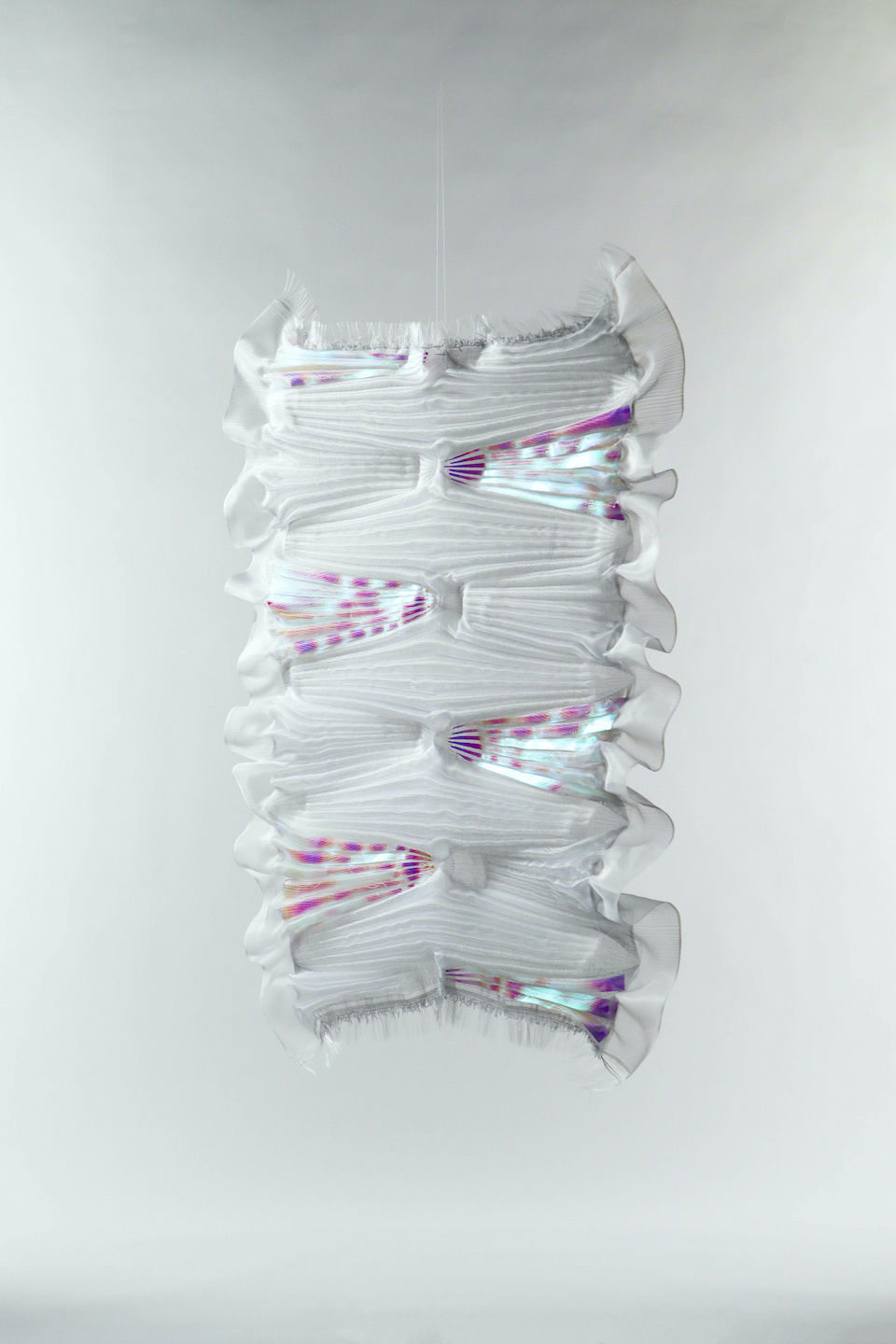 The project and methods used have been developed through experimental design research focused on designing a space in the woven material for the dichroic filter to exist and showcase its potential as a colourant in a woven design.