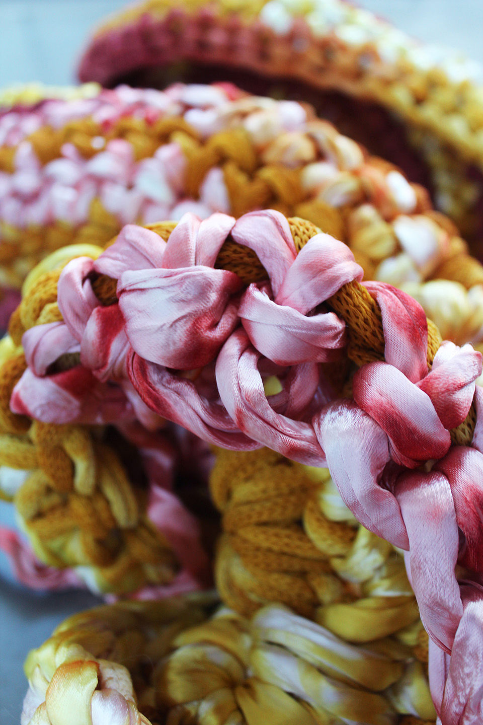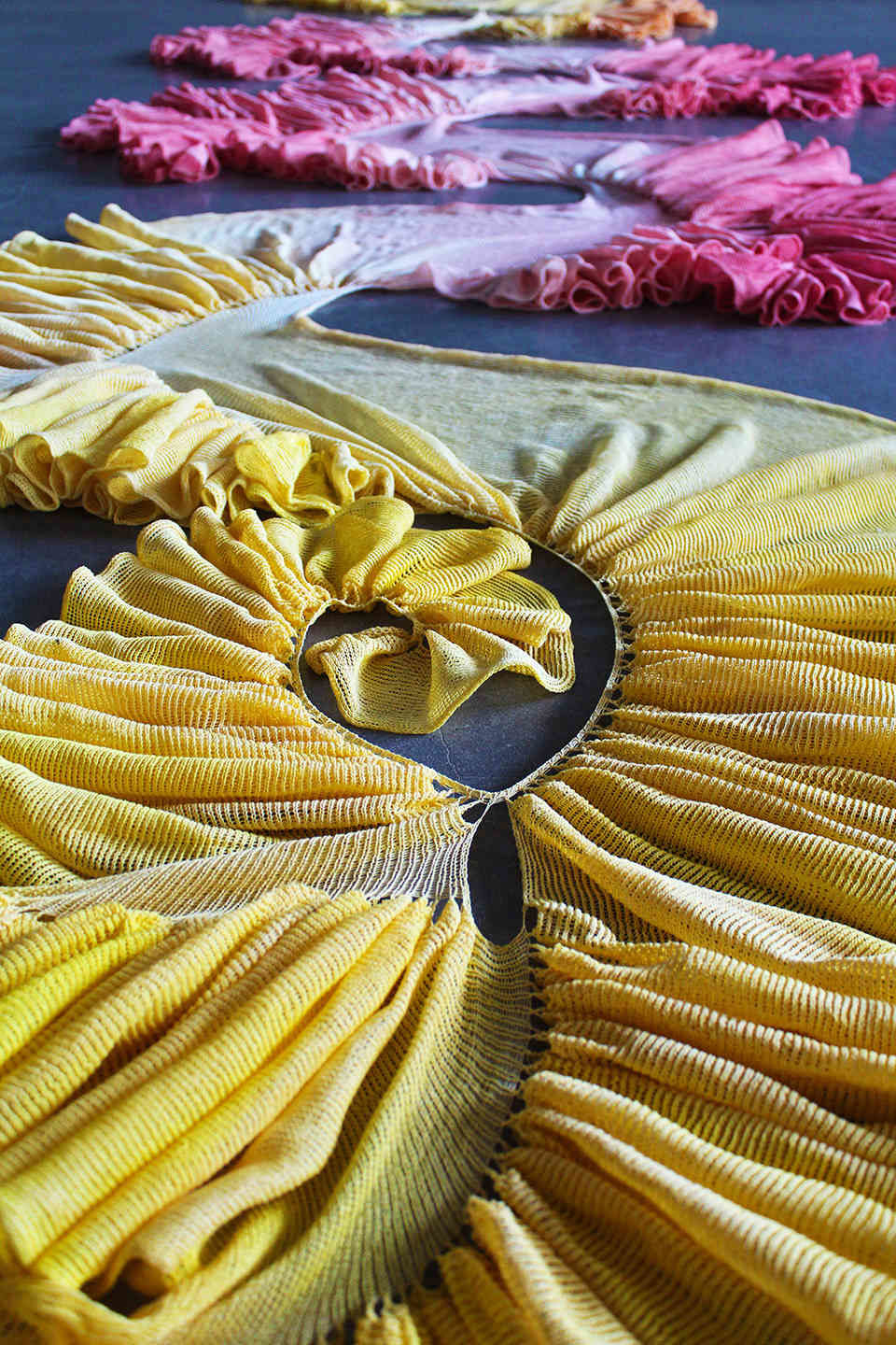 Since all materials are somehow changing through time, there is a need to consider changeability in the designing, where the inherent properties of the material are of significance to a product’s development and design identity. This work has an artistic approach to sustainability rather than scientific, with an ideological perspective to be explored and communicated in the aesthetics. Through changing colours of natural pigments and through unraveling and reconstruction of dyed tricot forms, unconventional colouring and forming relationships are suggested in this work, with the intention to expand the field of interior design.
