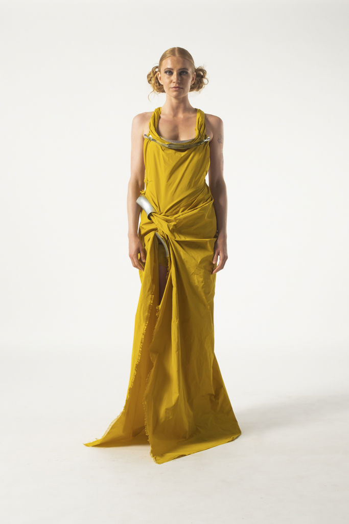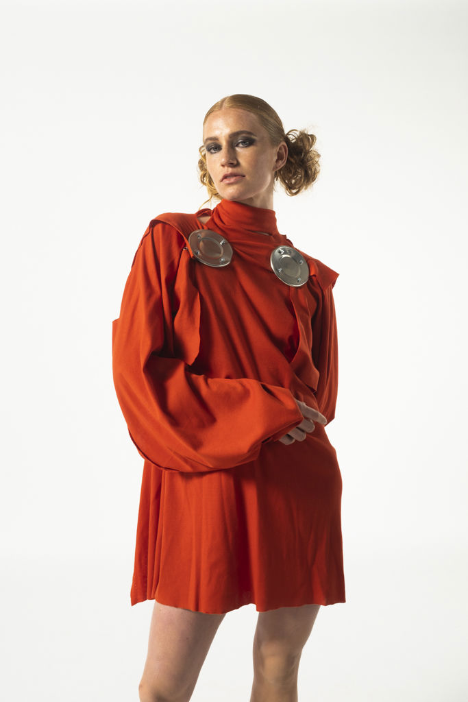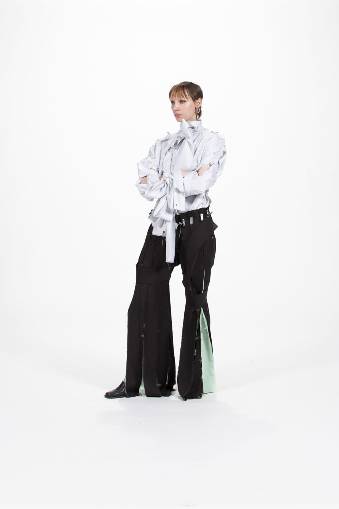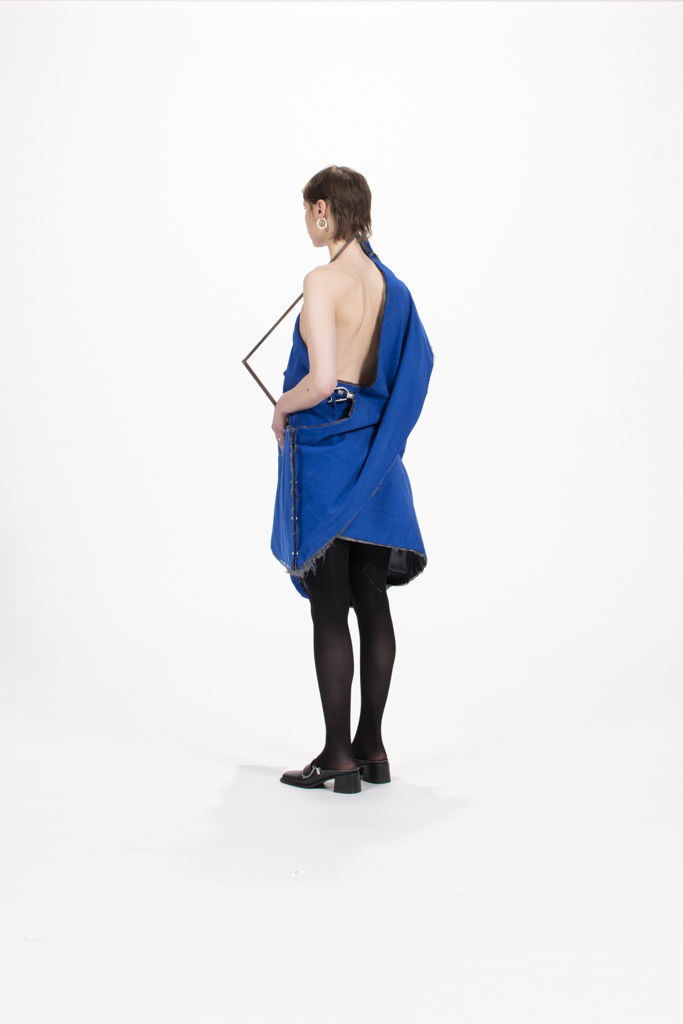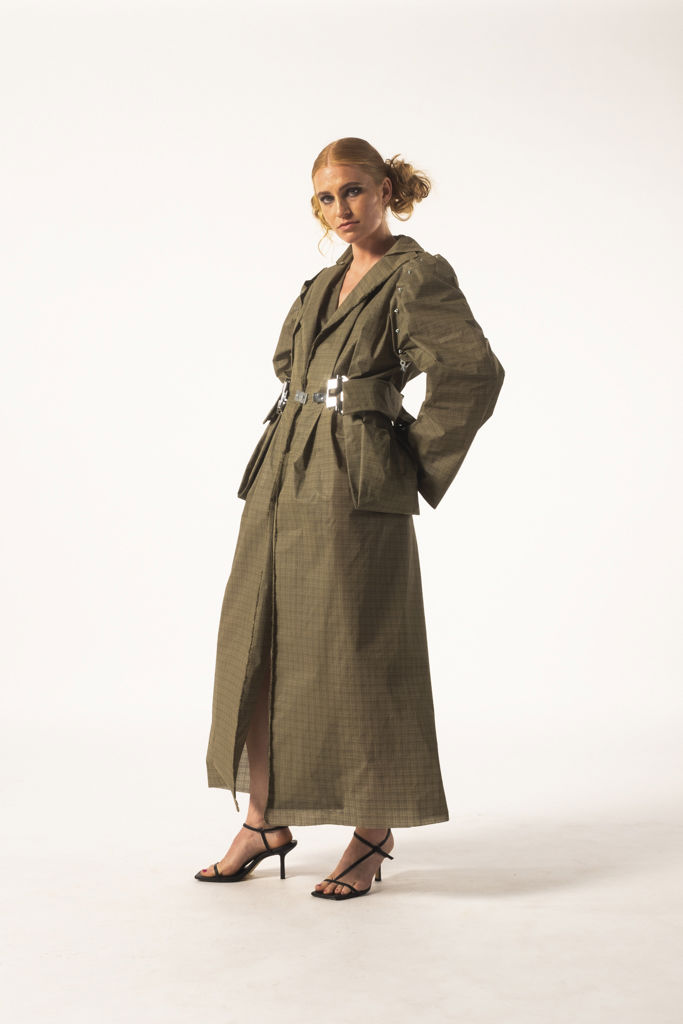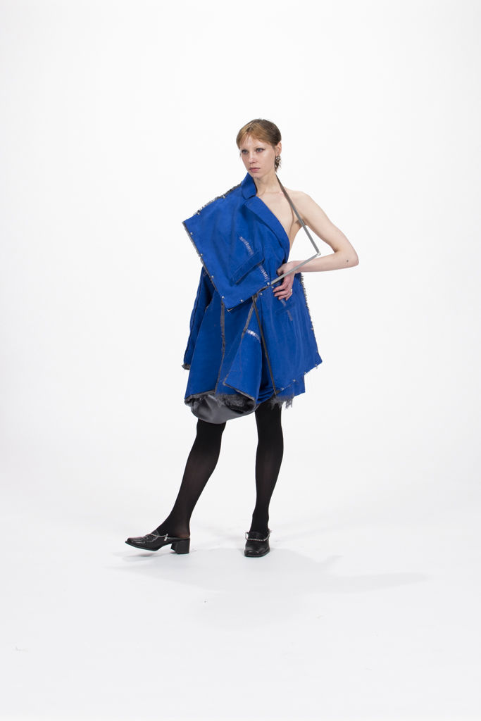 The project explores the potential of using unconventional materials - especially second-hand metal hardware - to inform and assemble new garment forms using bespoke tailoring practices. Garments of raw, almost punk expression are constructed without a sewing machine into tailored silhouettes for the womenswear workwear wardrobe. The project was carried out with attention to sustainable practices, through the use of zero-waste pattern cutting based on using rectangular pattern pieces, and moreover by sourcing metal hardware second-hand and textiles only from dead stock.