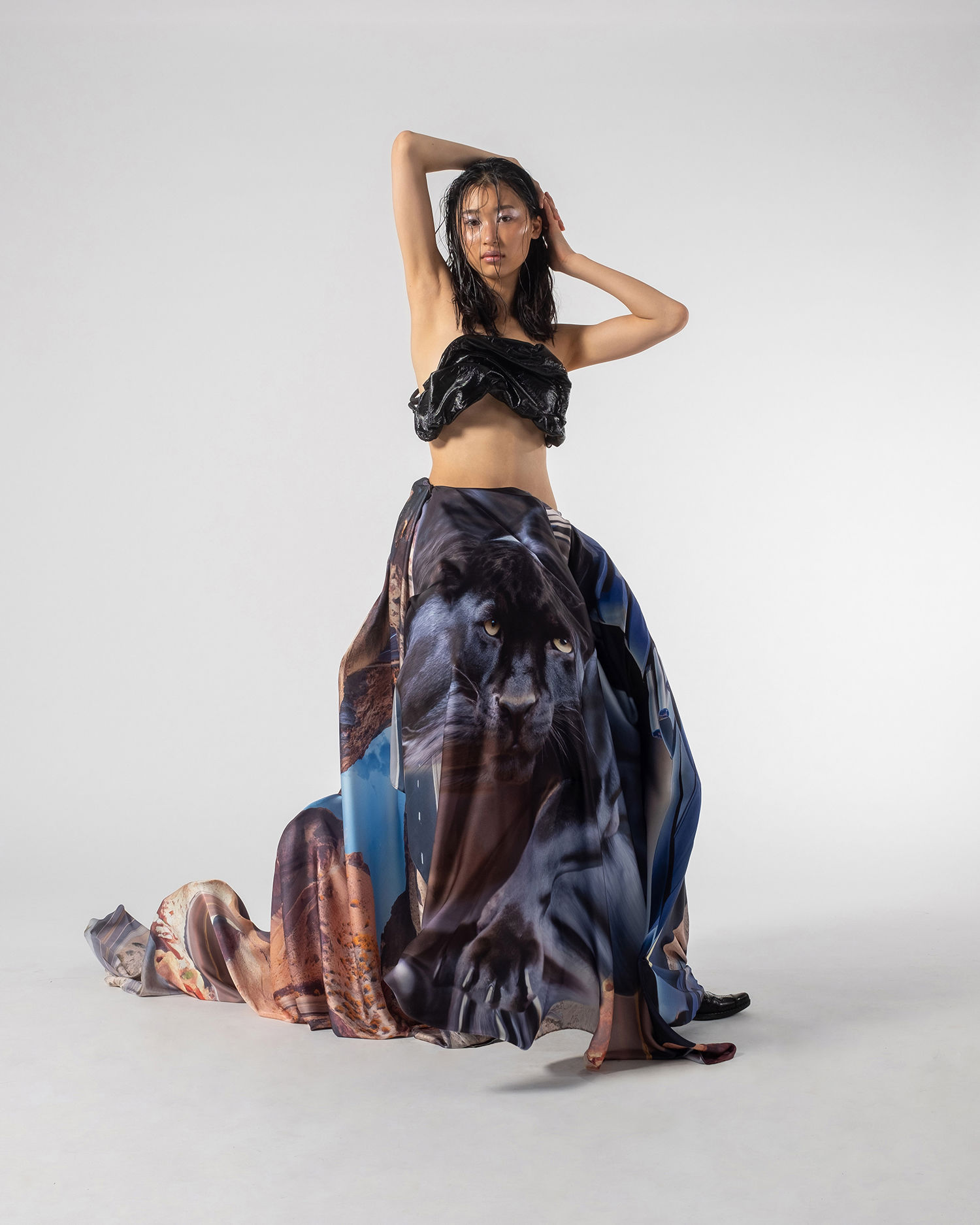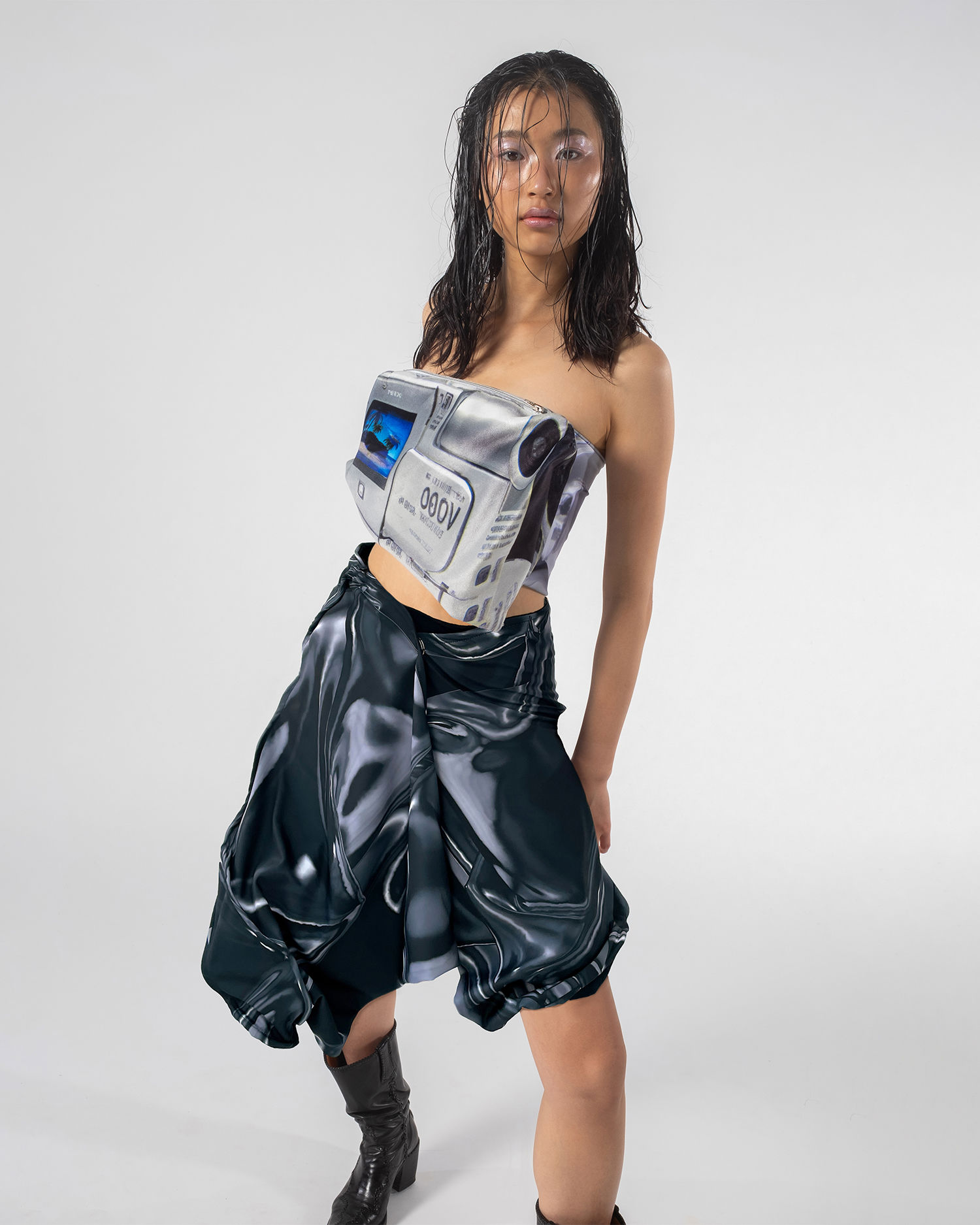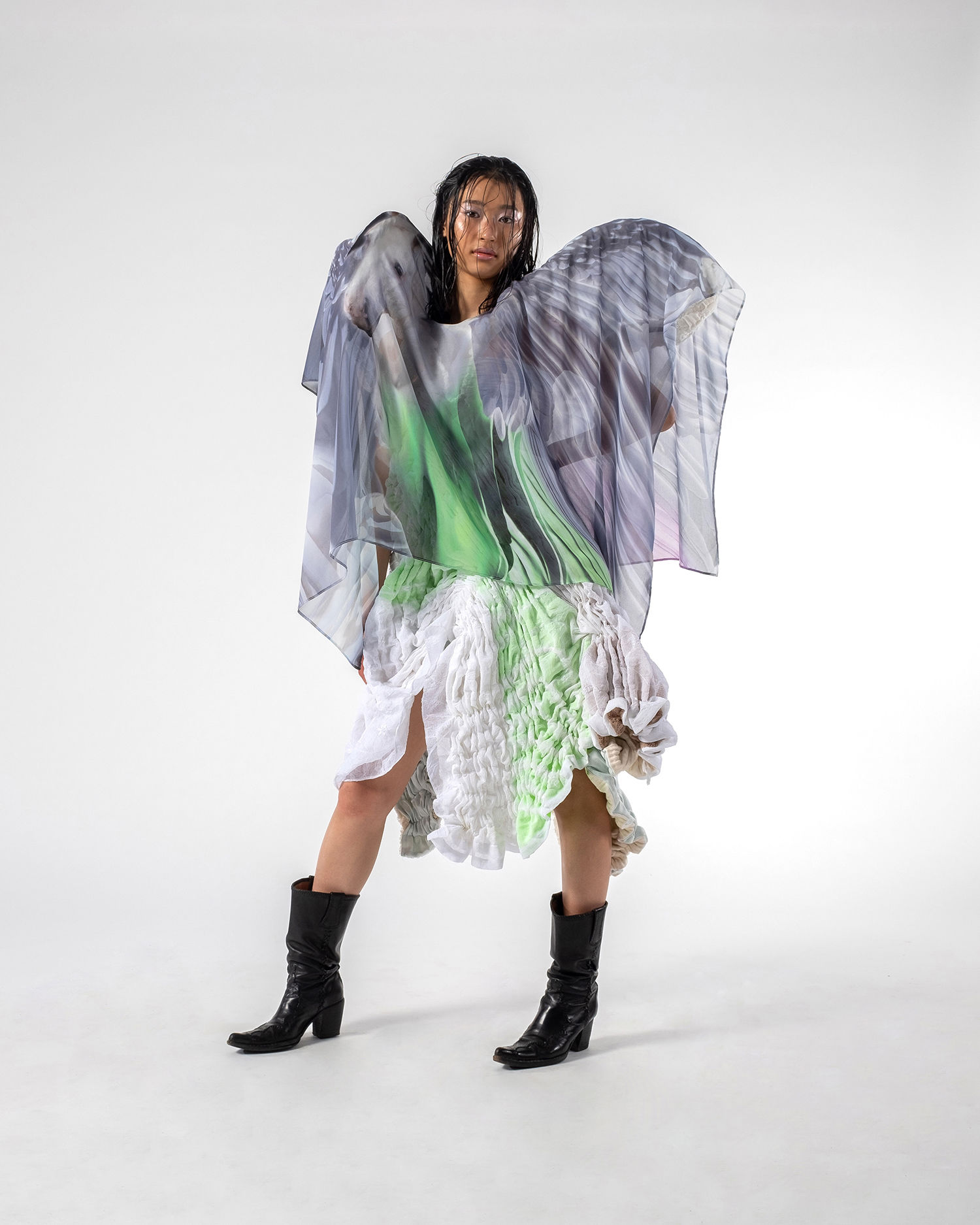 The degree work balances the intersection between digital and physical fashion design in search of a hybrid state, reflecting our present time. The project aims to establish a new type of print development methodology with AI tools and 3D software, that supports one’s existing toolkit and strengthens the human-centered design instead of replacing it. Through experimental garment construction, the 2D prints are given 3D depth, while applied distortion and glitch effects highlight the illusion of digital applications in the physical environment.