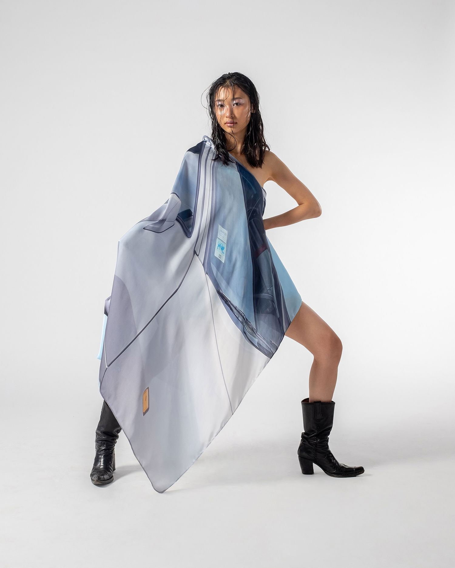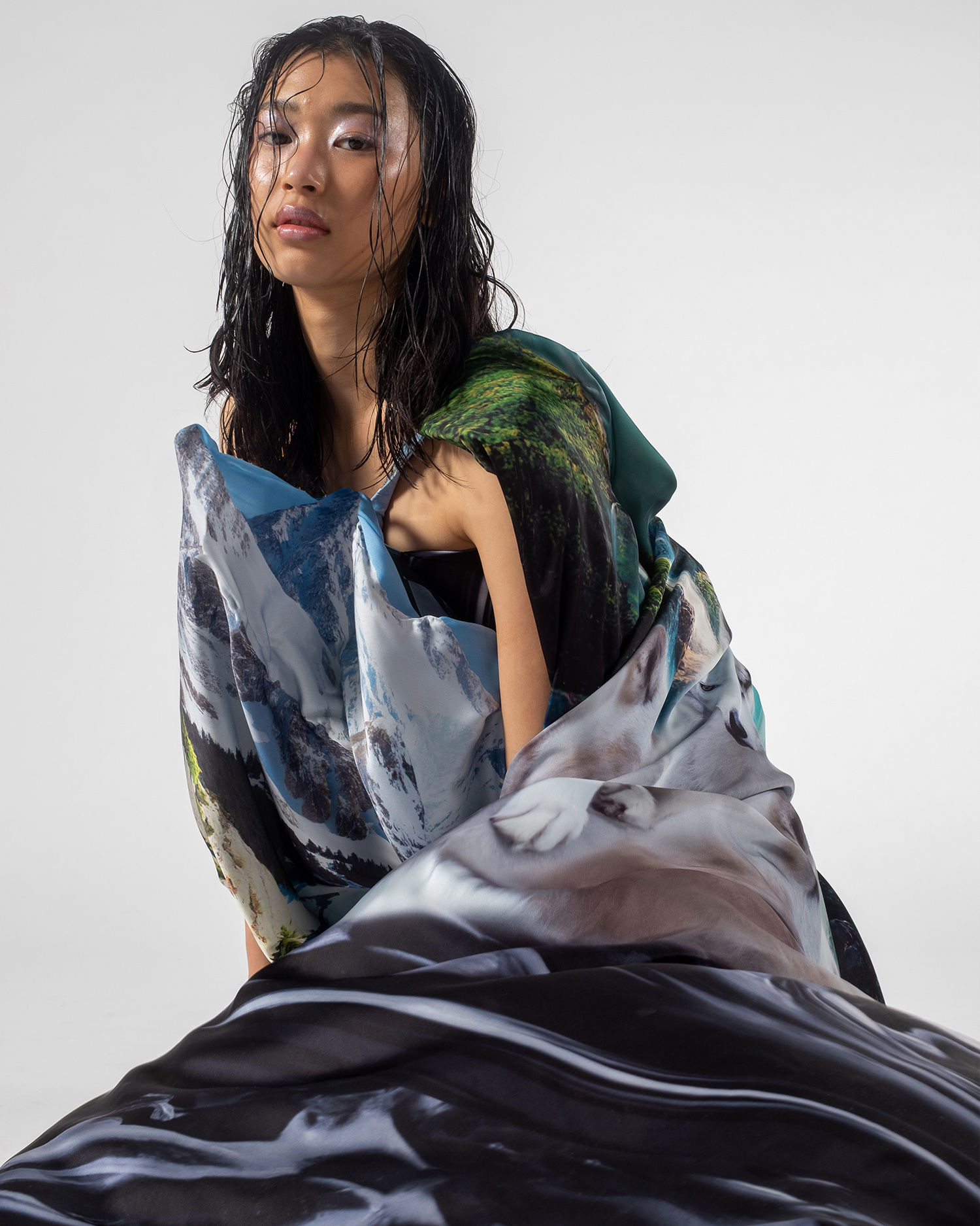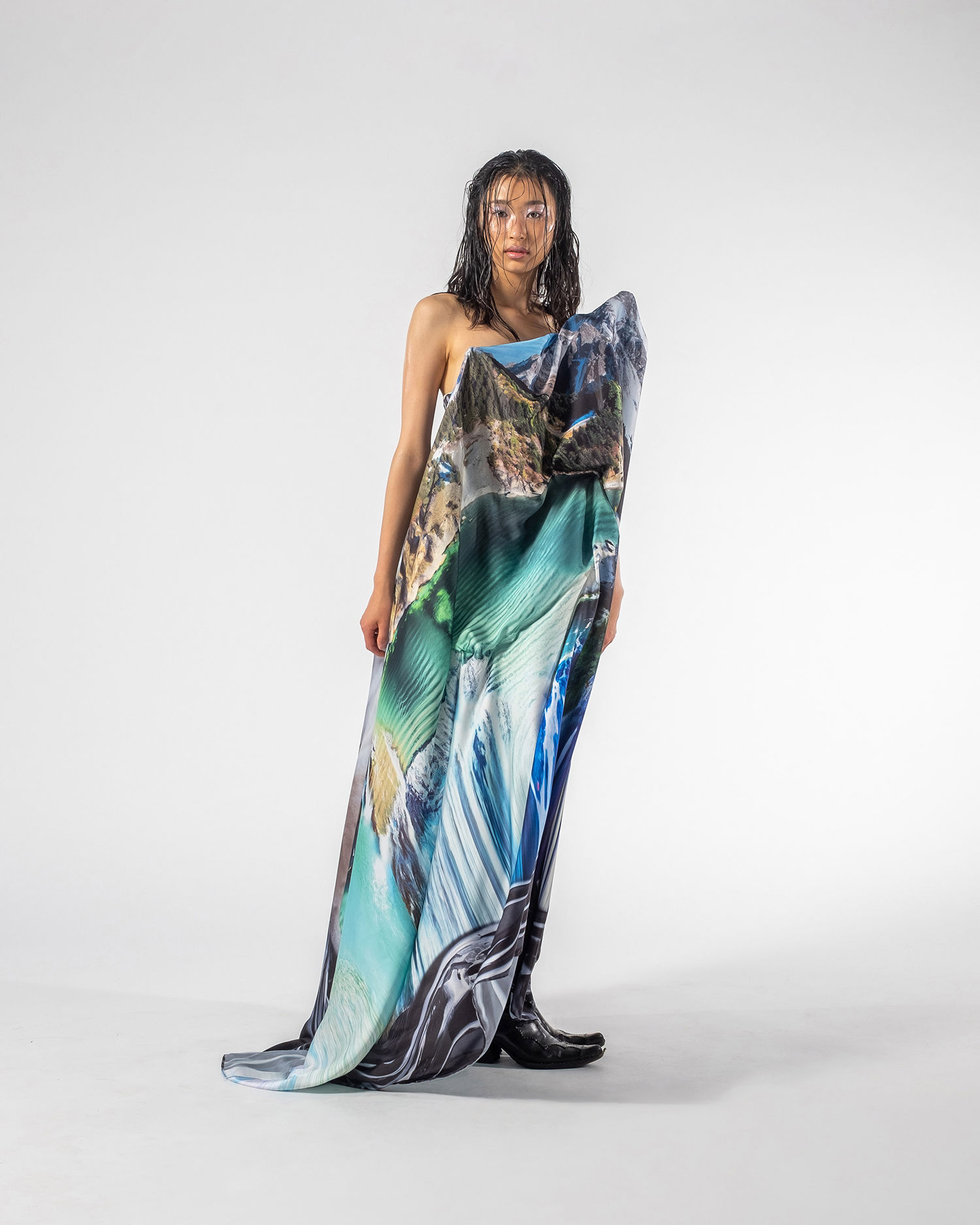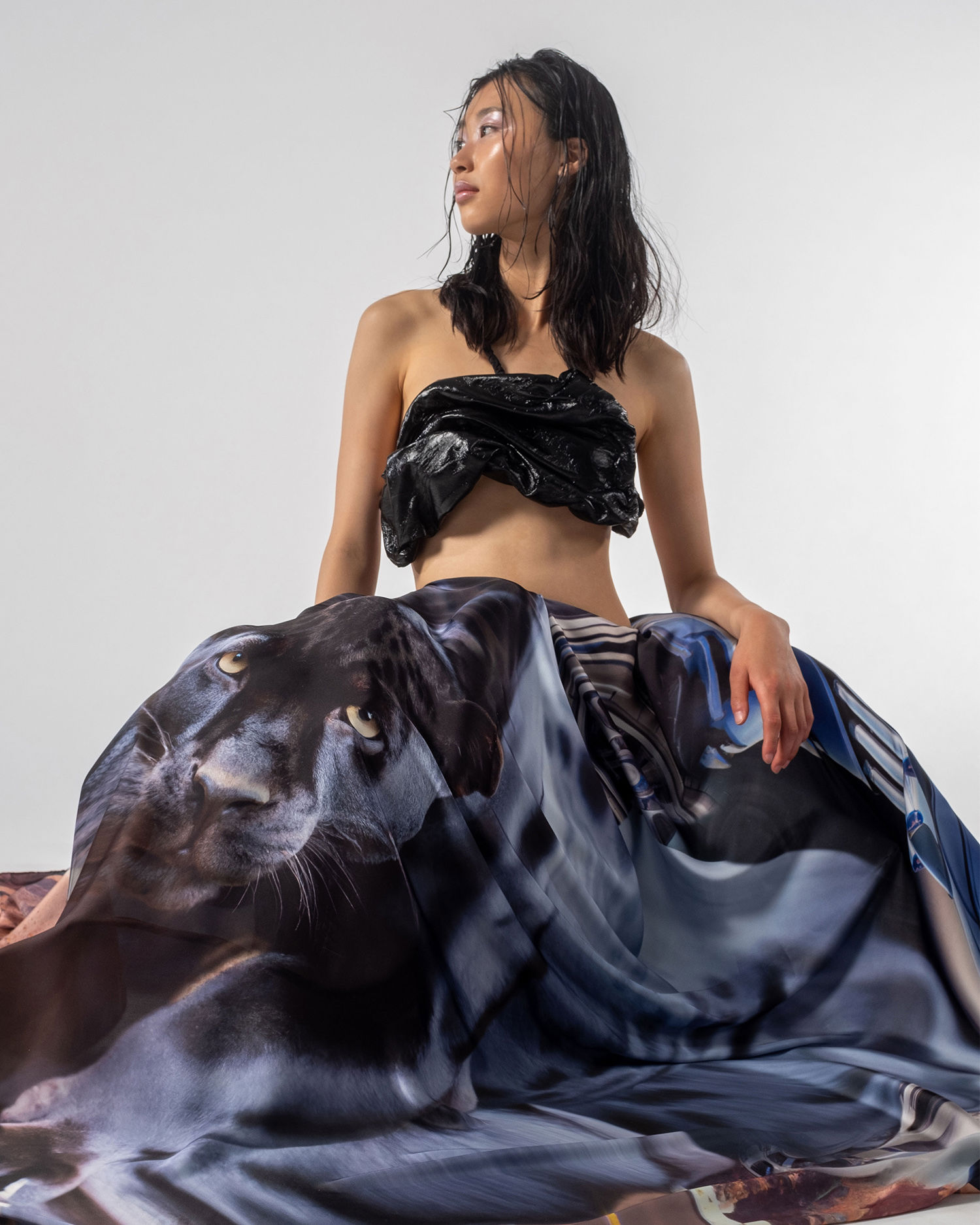 The degree work balances the intersection between digital and physical fashion design in search of a hybrid state, reflecting our present time. The project aims to establish a new type of print development methodology with AI tools and 3D software, that supports one’s existing toolkit and strengthens the human-centered design instead of replacing it. Through experimental garment construction, the 2D prints are given 3D depth, while applied distortion and glitch effects highlight the illusion of digital applications in the physical environment.