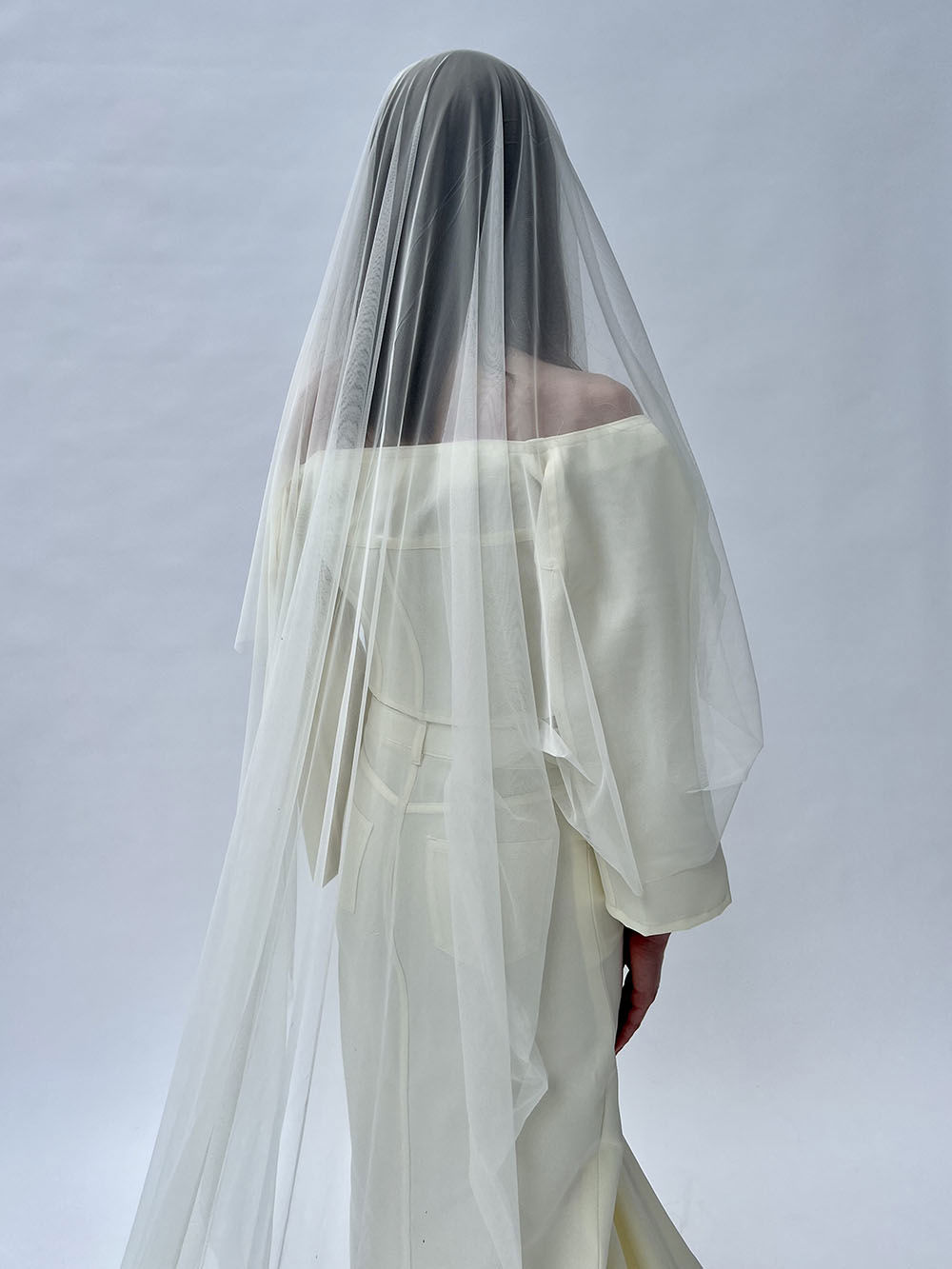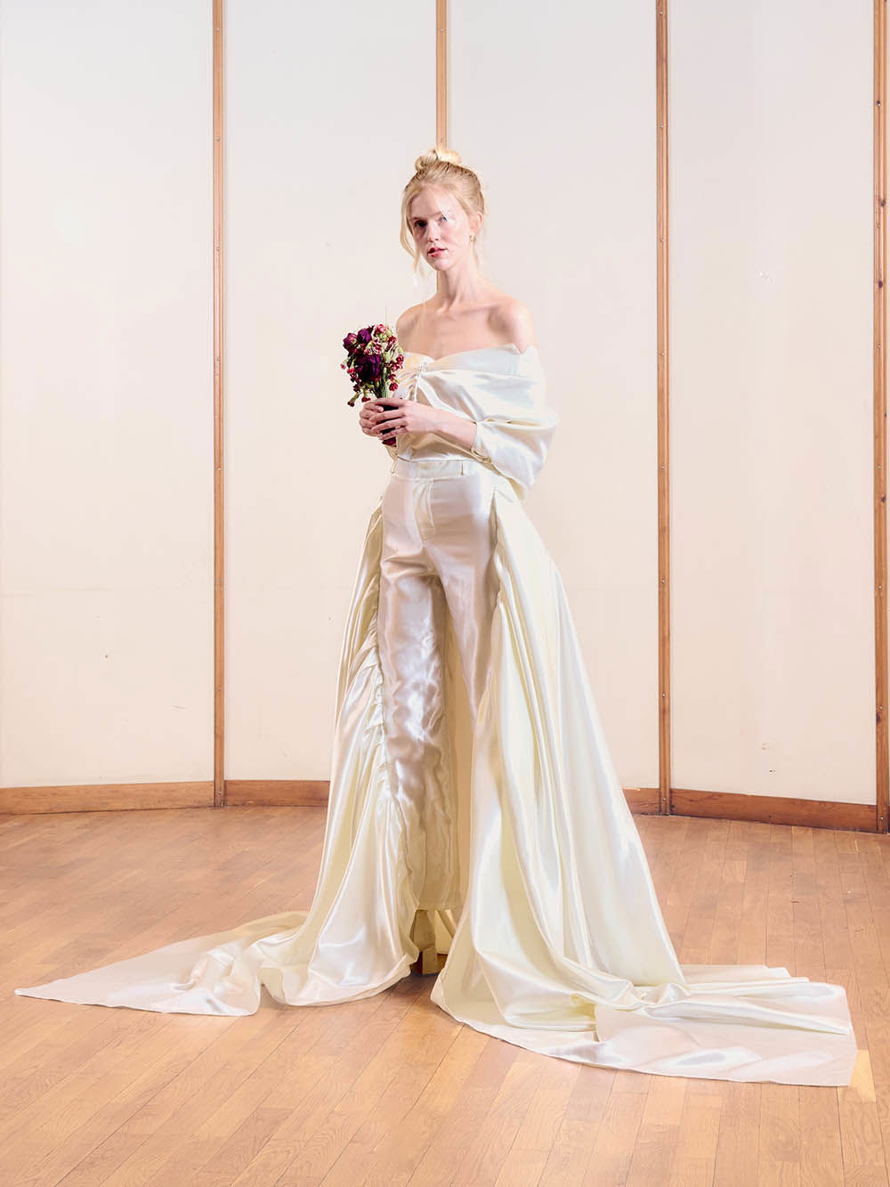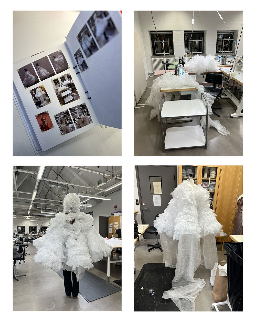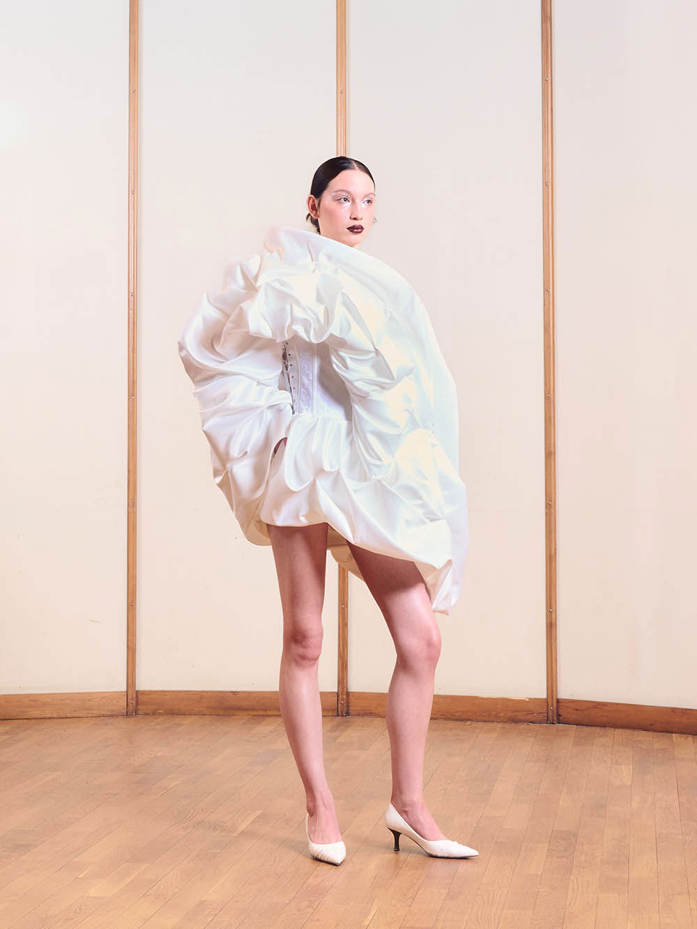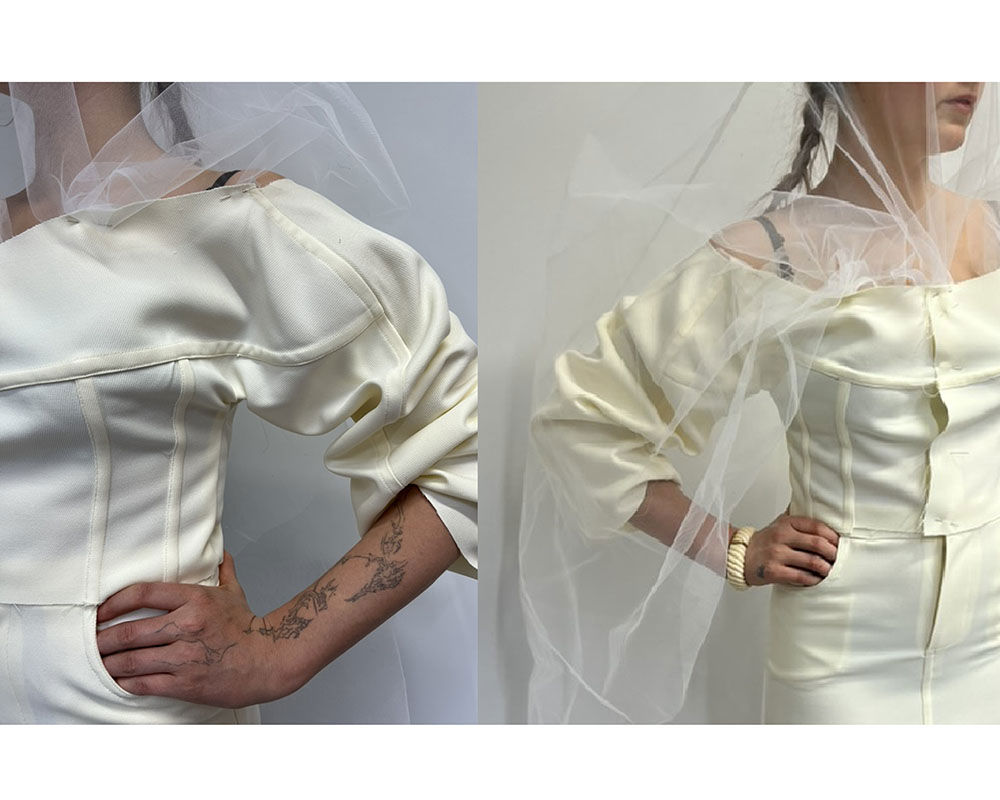 Through research into historical and contemporary bridal wear, common cuts and forms are identified and reinterpreted through experimental construction techniques. The result is a collection of five bridal garments that redefine the silhouette by shifting volume and altering garment architecture. While retaining recognisable bridal elements such as white tones, the designs offer a forward-thinking approach that balances innovation with tradition.