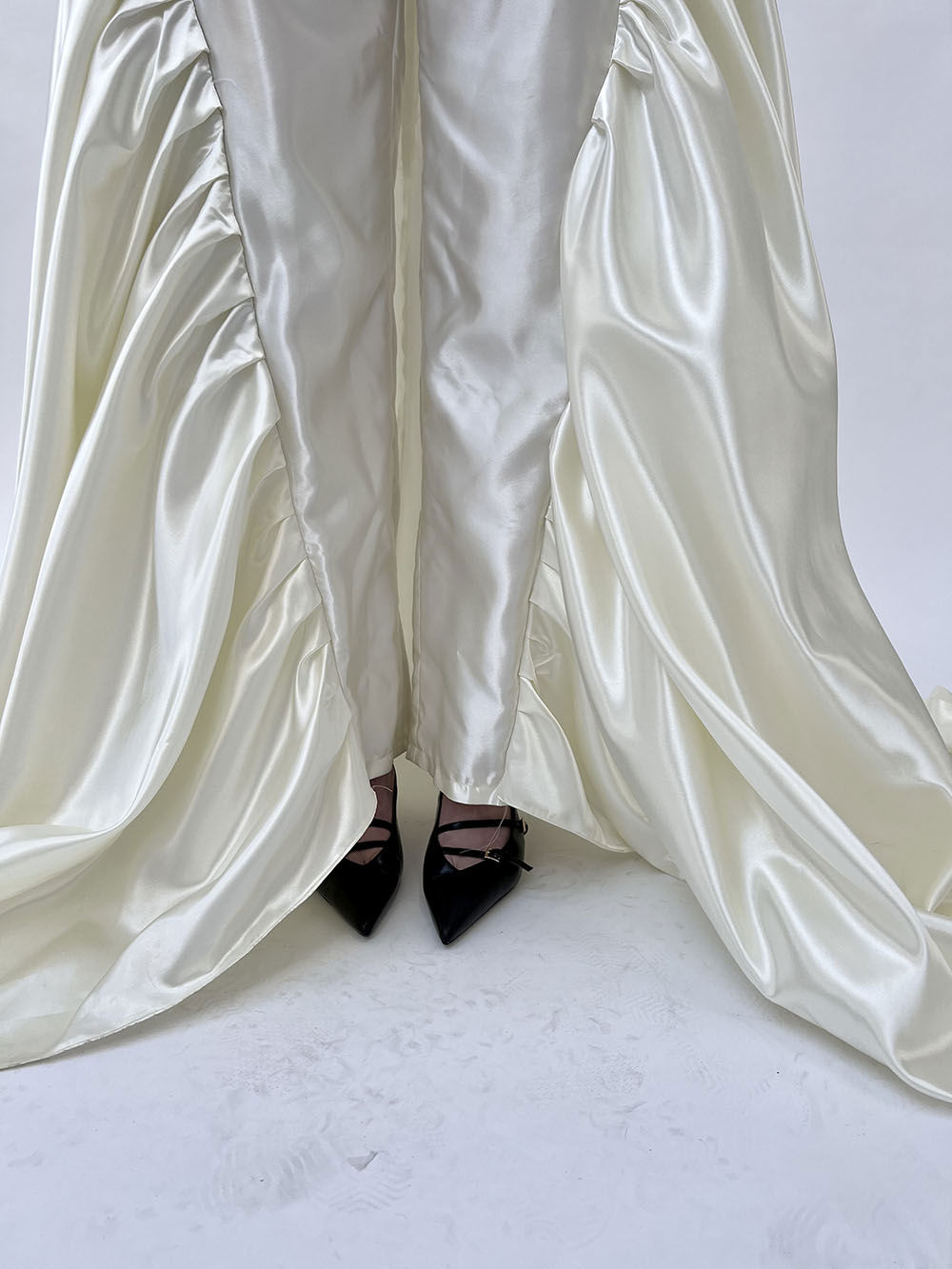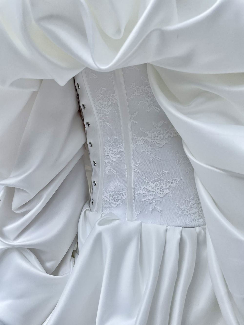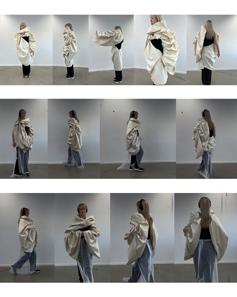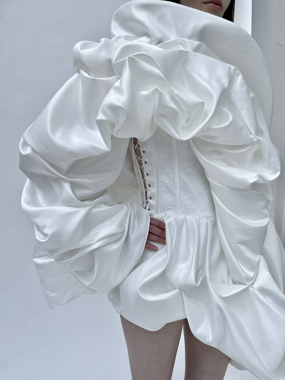 Through research into historical and contemporary bridal wear, common cuts and forms are identified and reinterpreted through experimental construction techniques. The result is a collection of five bridal garments that redefine the silhouette by shifting volume and altering garment architecture. While retaining recognisable bridal elements such as white tones, the designs offer a forward-thinking approach that balances innovation with tradition.