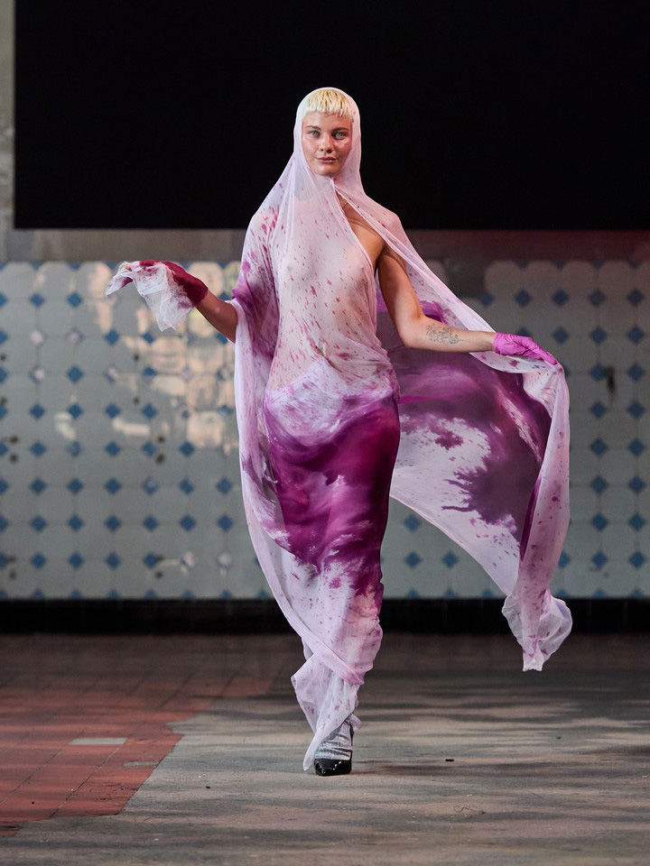 This research challenges the conventional rejection of stains in fashion. Instead of treating them as aesthetic embellishments, Liquid Relics integrates stains into the design process through draping. The aim of the project was to explore the possibilities of stain for defining new body relations through draping methods.