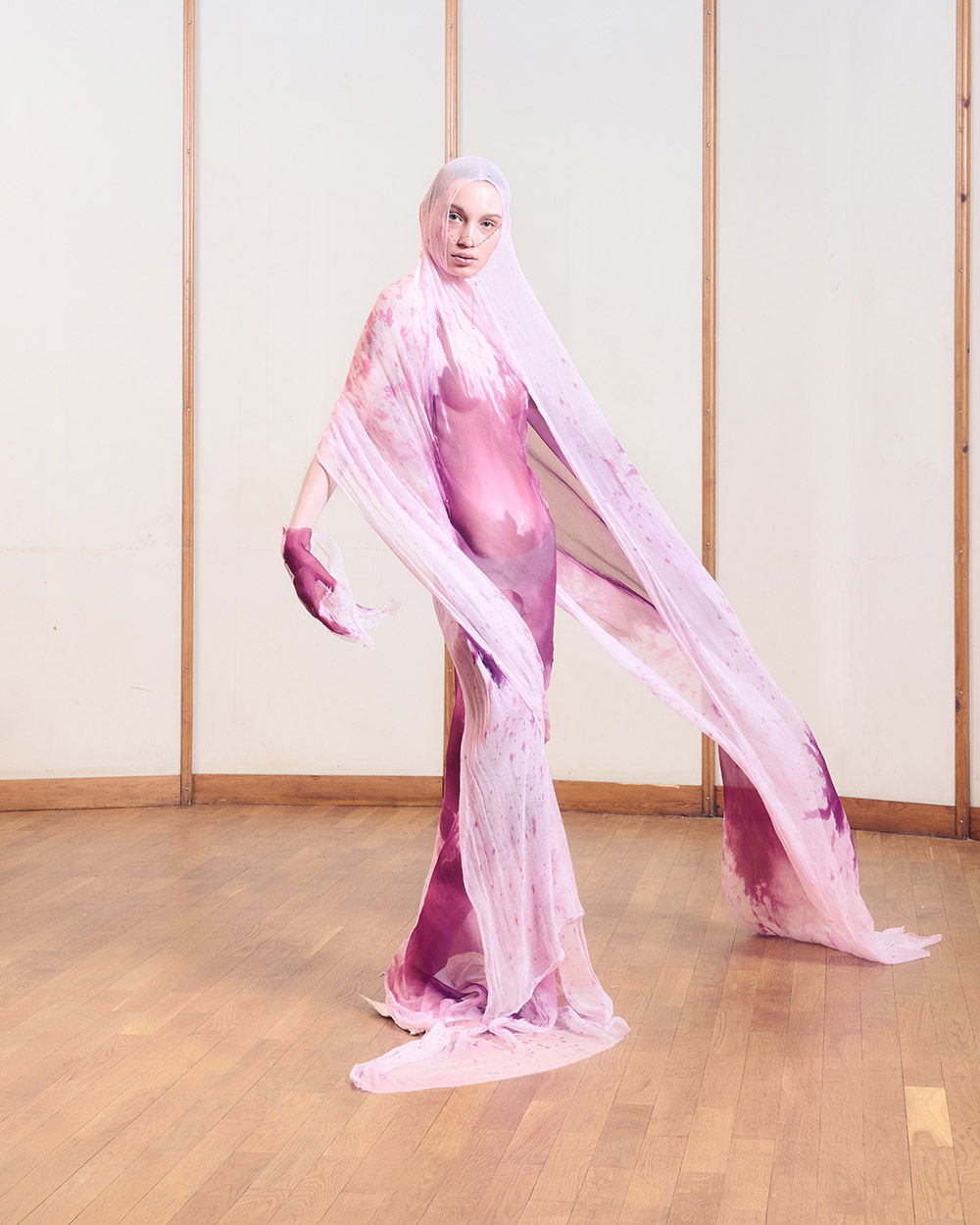 Instead of being confined to pre-existing silhouettes, the design process follows the fluidity of abstract splashes, draping them and documenting the evolving forms. Drawing from Hellenic techniques, where fabric follows the body’s natural form, the project explores how stains can shape garments independently. It embraces spontaneity, imperfection, and material transformation, redefining stains as symbols of creation rather than flaws, and prioritizing process over final outcome.