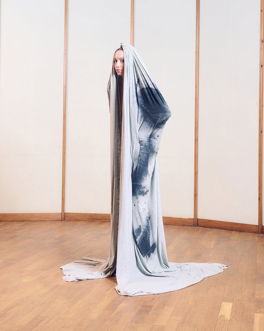 This research challenges the conventional rejection of stains in fashion. Instead of treating them as aesthetic embellishments, Liquid Relics integrates stains into the design process through draping. The aim of the project was to explore the possibilities of stain for defining new body relations through draping methods.