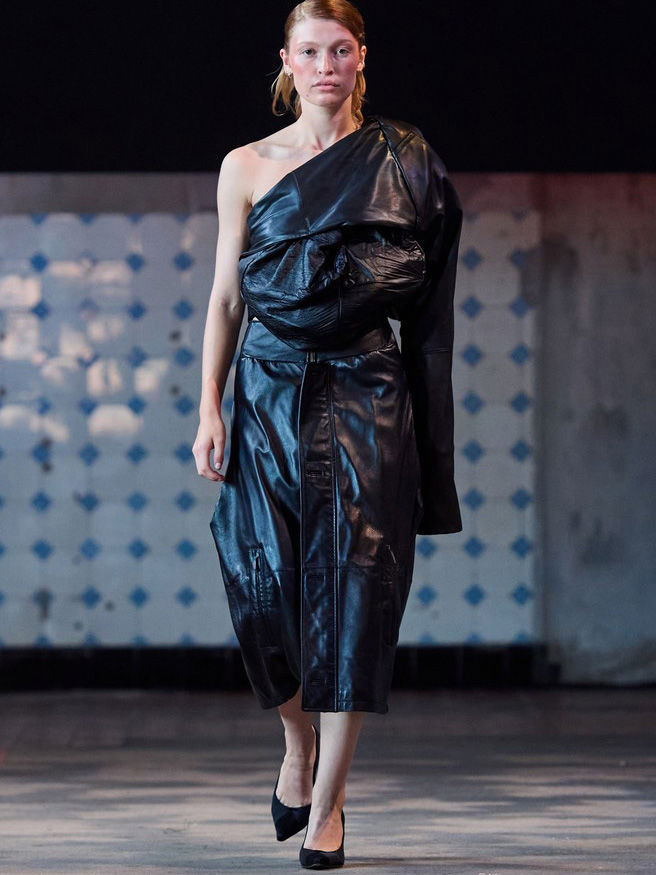 To fully explore the potential of discarded garments, materials ranging from damaged, low-quality clothing to high-quality discarded pieces have been chosen. Especial focus in the selection of garments has been on varying jersey qualities, denim, and leather, combined with more lightweight fabrics like crepe and chiffon. The collection alternates between carefully hand-sewn, one-of-a-kind pieces and more ready-to-wear designs.