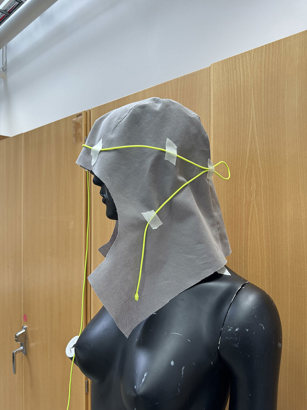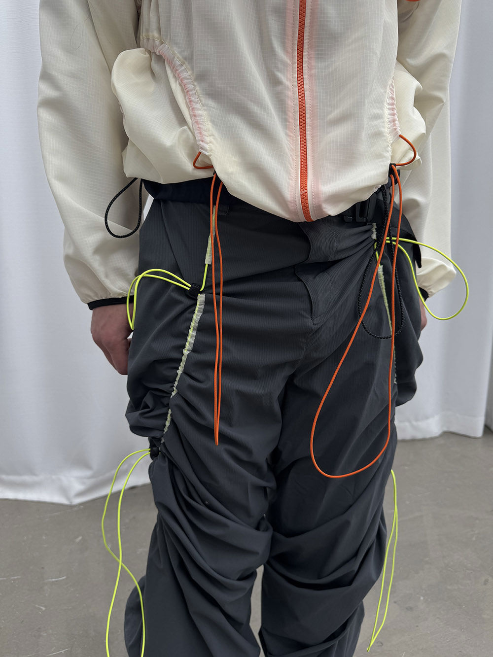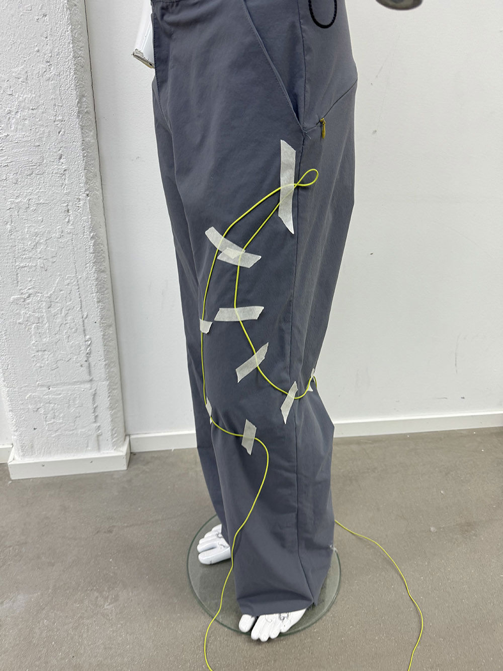 An experimental design approach was used, prioritizing repeated exploration and hands-on learning. The process included functional testing of cord systems through samples, body draping, garment construction, and fabric/print development. The outcome is a cohesive collection of five hiking-inspired outfits, with finding of how cord systems function both as a visual expression and as an active design tool, enabling interaction between materials and the human body.