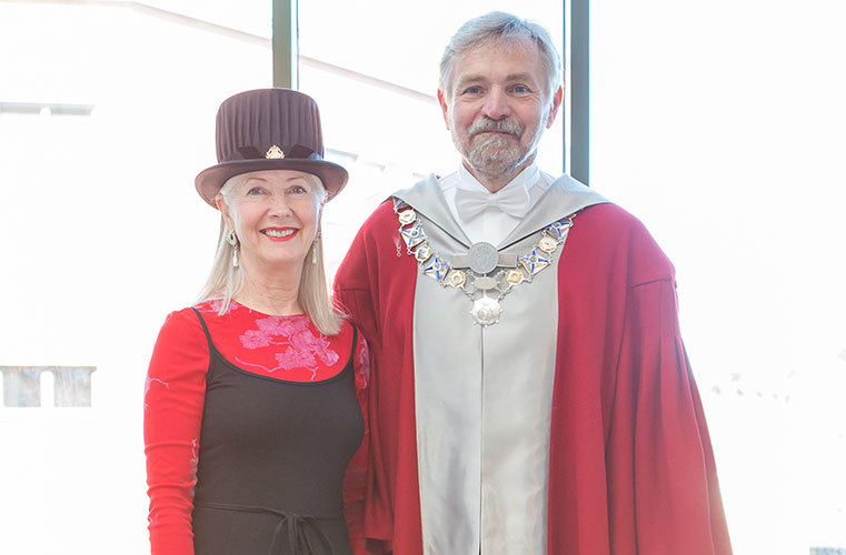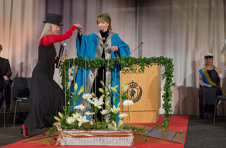 I år promoverades högskolans första hedersdoktor Clare Johnston och fem nyblivna doktorer deltog i promotionshögtiden:
