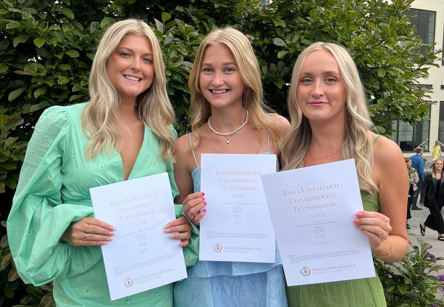 Utmärkelsen för bästa uppsats och uppsatsprocess är en intern utmärkelse som delades ut första gången inom textilekonomutbildningen 2022 i samband med avslutningsceremonin. Filippa, Caroline och Astrid tilldelades den med följande motivering: