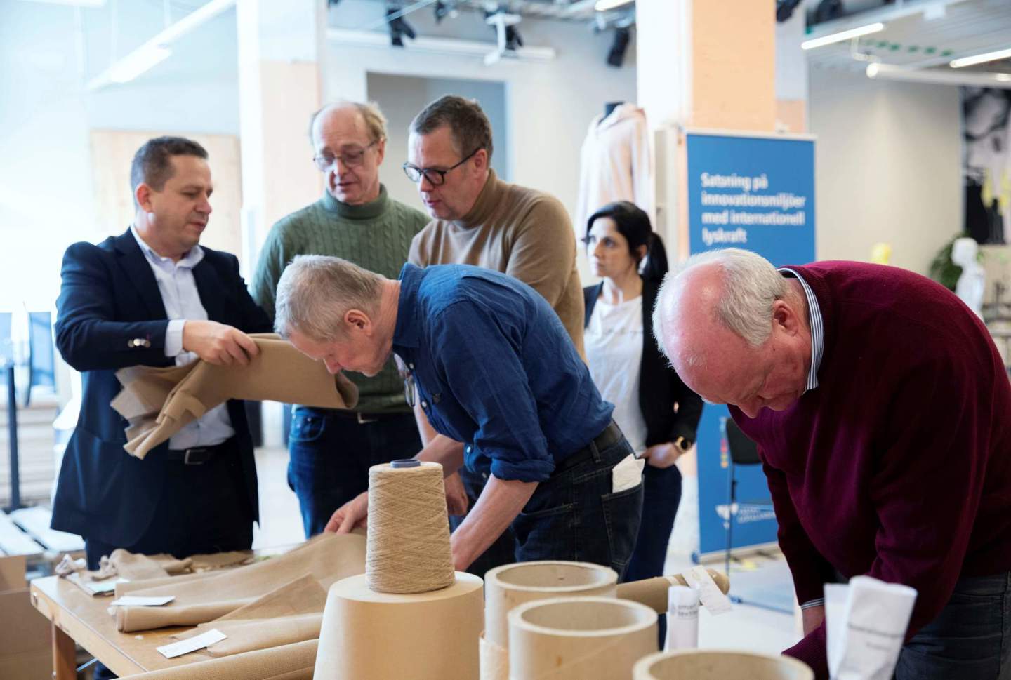 Under ett avslutande projektmöte i DO-tank Center fick deltagarna i projektet känna på det nya materialet. Till höger Anna Berglund, projektledare Science Park Borås.