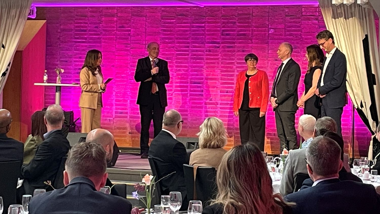 Från vänster: Sarit Monastyrski, Per-Olof Hygren Sparbankstiftelsen Sjuhärads ordförande, Kerstin Hermansson (C) förste vice ordförande i Kommunstyrelsen i Borås Stad, Mats Tinnsten rektor vid Högskolan i Borås, Nadja Bengtsson VD Sparbanksstiftelsen Sjuhärad, Hans-Christian Ackermann vice VD Sparbanken Sjuhärad.