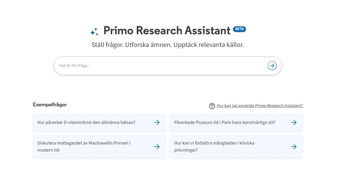 Primo Research Assistant är ett AI-drivet verktyg integrerat i Primo som hjälper till att utforska akademiskt innehåll genom frågor ställda på naturligt språk. Verktyget använder bibliotekets elektroniska samlingar samt hela indexet i Primo för att hitta de mest relevanta dokumenten och extraherar den viktigaste informationen från de fem bästa källorna för att svara på frågan.