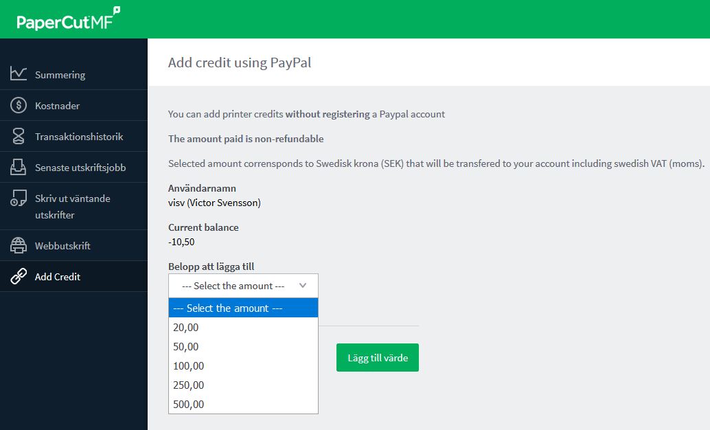 Välj det belopp som du önskar ladda ditt utskriftskonto med. 1 kr motsvarar 1 utskriftskredit. När du gjort ditt val klickar du på "Add Value".