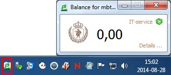 Om du är inloggad på datorer här på högskolan kan du enkelt se ditt aktuella saldo via en ikon nere till höger vid klockan. Dubbelklicka på ikonen så öppnas en ruta som visar aktuellt saldo.