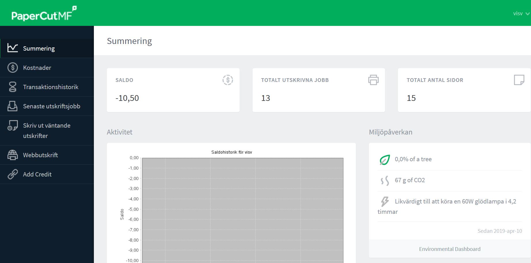Första sidan visar en sammanställning över ditt utskriftskonto, bland annat utskriftssaldo.
