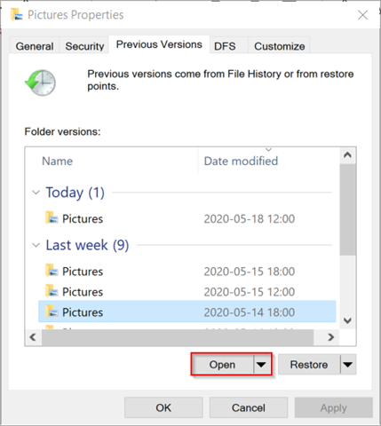 - Välj datum och tid du vill återställa till och tryck på “Open”. (Rekommendationen är att trycka på ”Open” istället för ”Restore” då man får möjlighet att granska filen/mappen innan den återställs.)