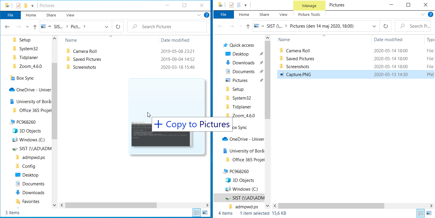 - Kopiera filen/mappen som ska återställas från snapshoten till den ursprungliga platsen. Vill man spara den återställda filen/mappen som en kopia, behöver man först byta namn på originalfilen så att den inte skrivs över. Alternativt kopierar man filen/mappen till en annan plats.
