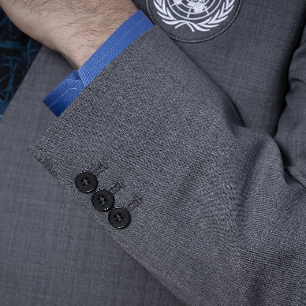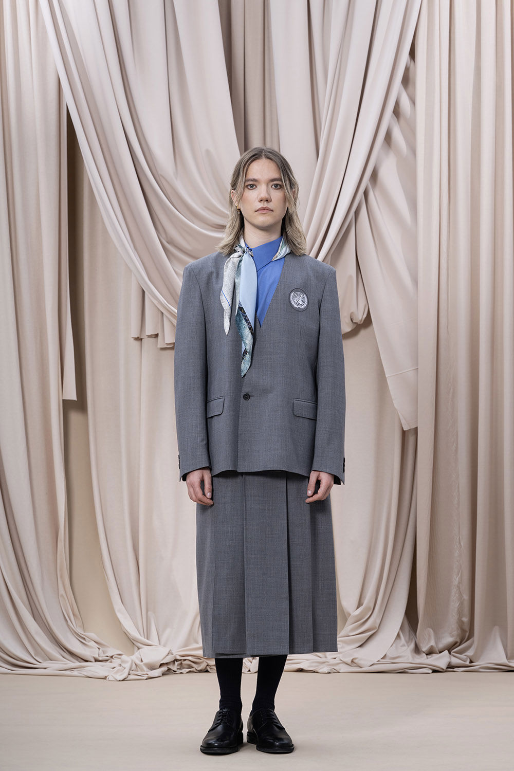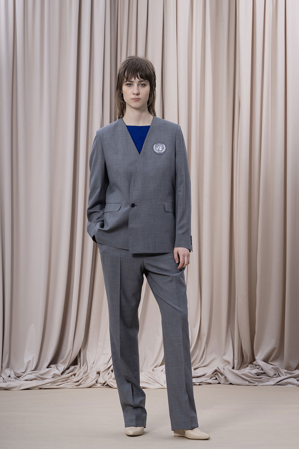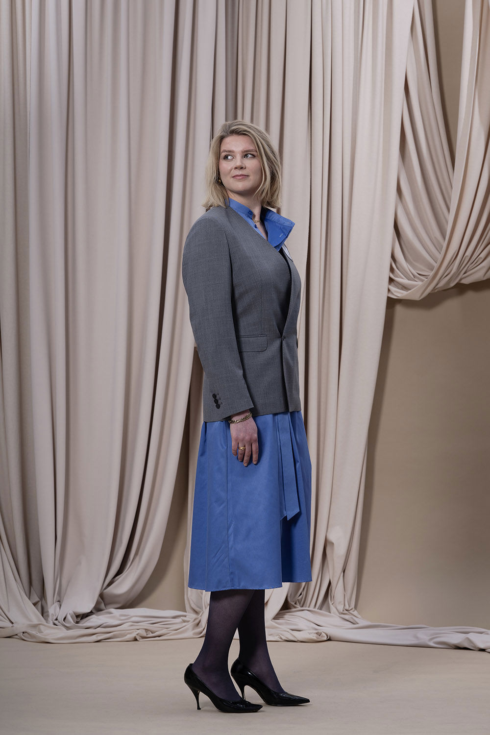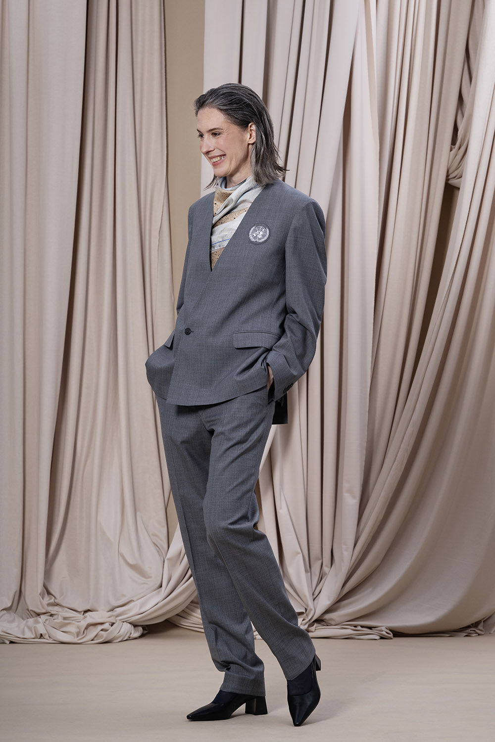 Dam- och herrplaggen har olika passform men samma uttryck för att åstadkomma en enhetlig look. Kavajen ger utrymme för rörelse. Kavajen är dubbelknäppt med en synlig och en dold knapp, samt en mjuk axelkonstruktion för ökad komfort.