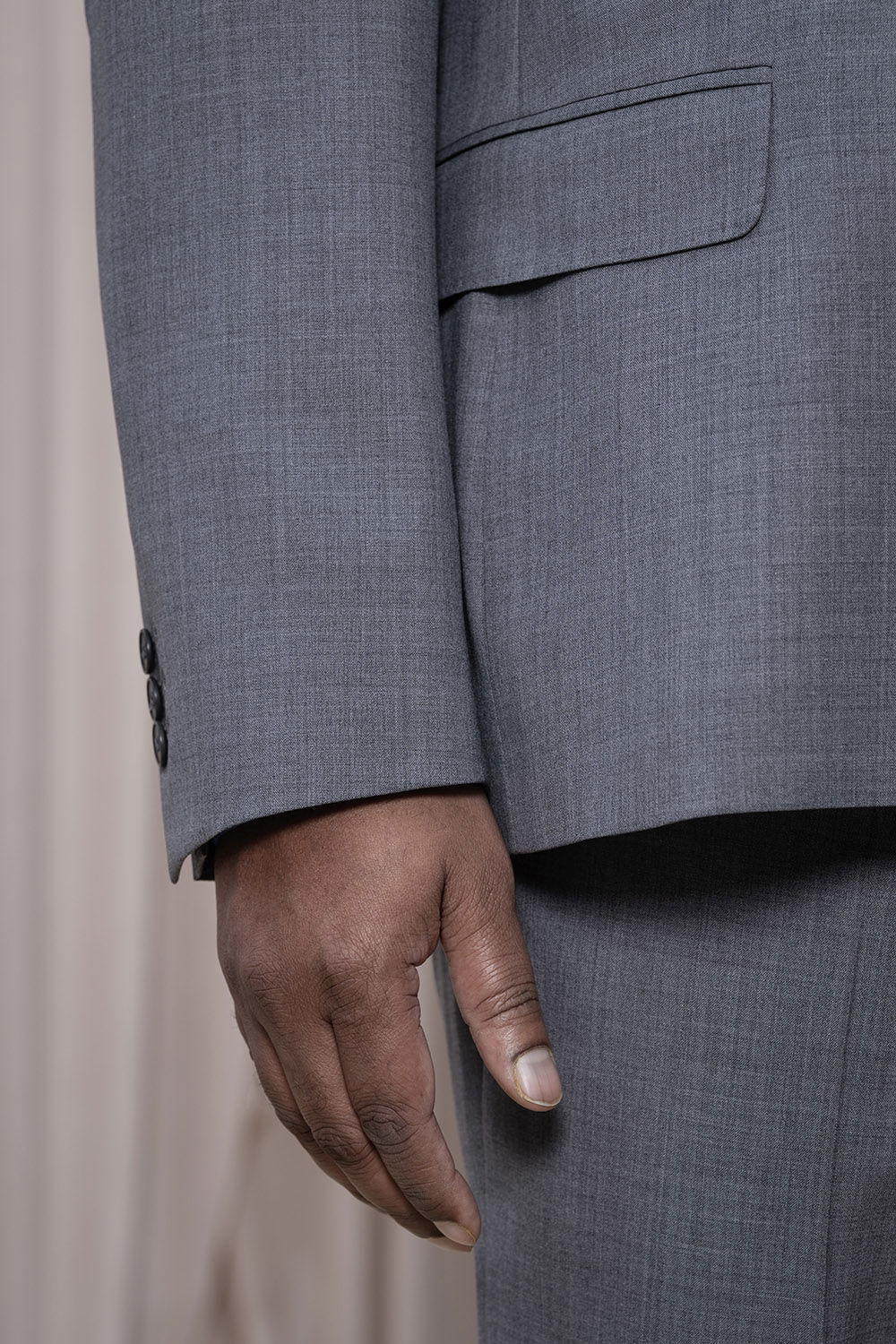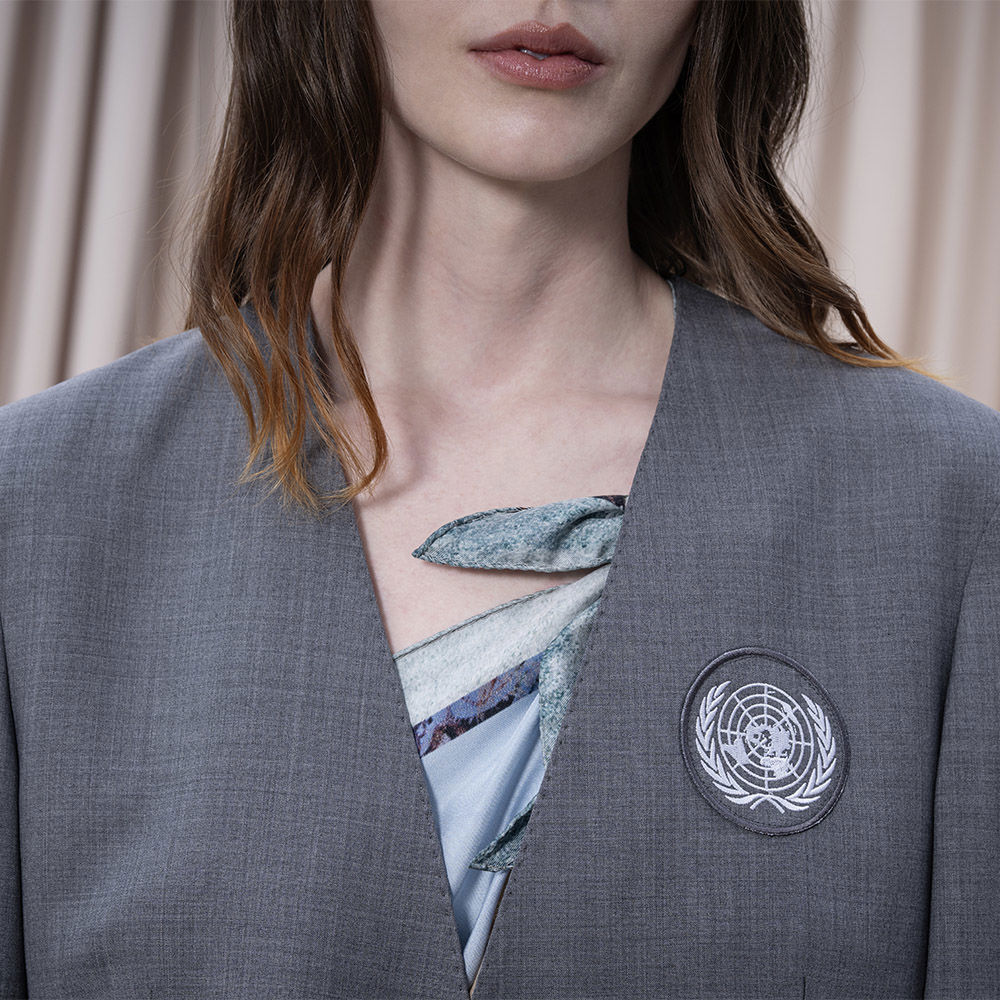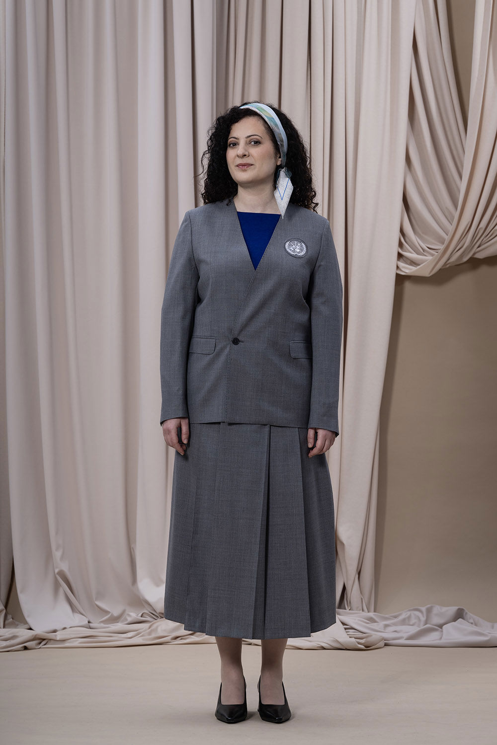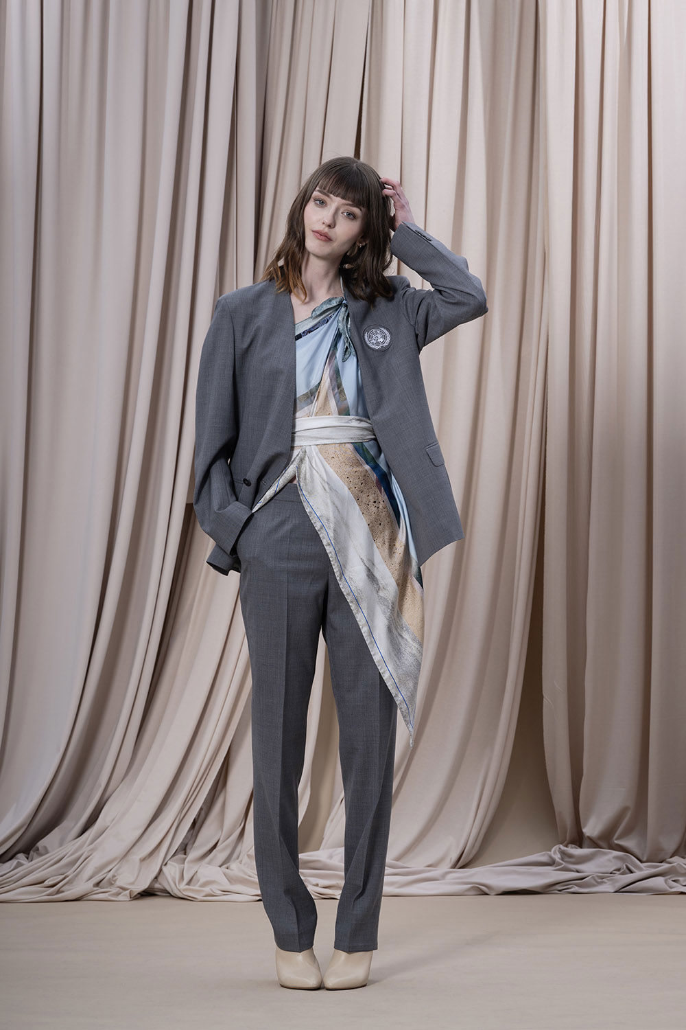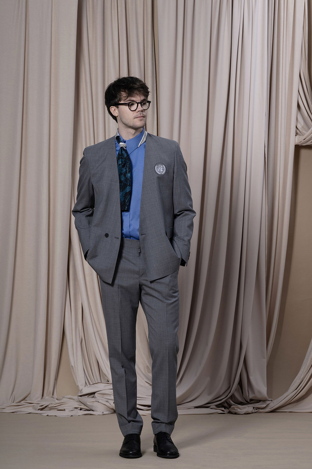 Dam- och herrplaggen har olika passform men samma uttryck för att åstadkomma en enhetlig look. Kavajen ger utrymme för rörelse. Kavajen är dubbelknäppt med en synlig och en dold knapp, samt en mjuk axelkonstruktion för ökad komfort.