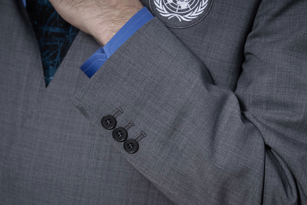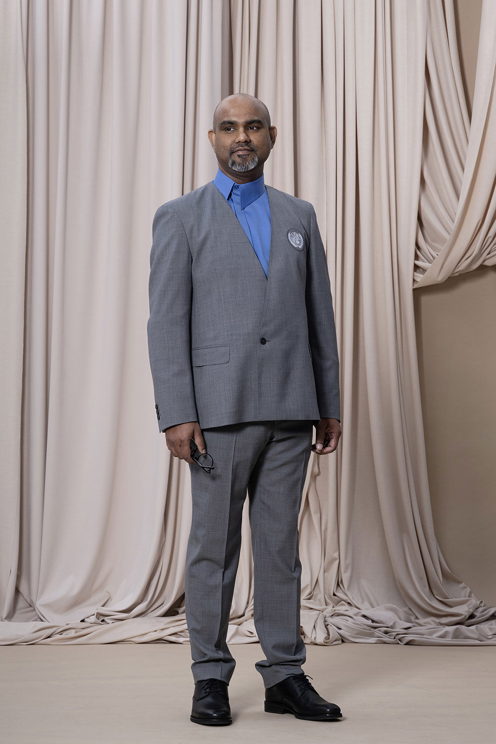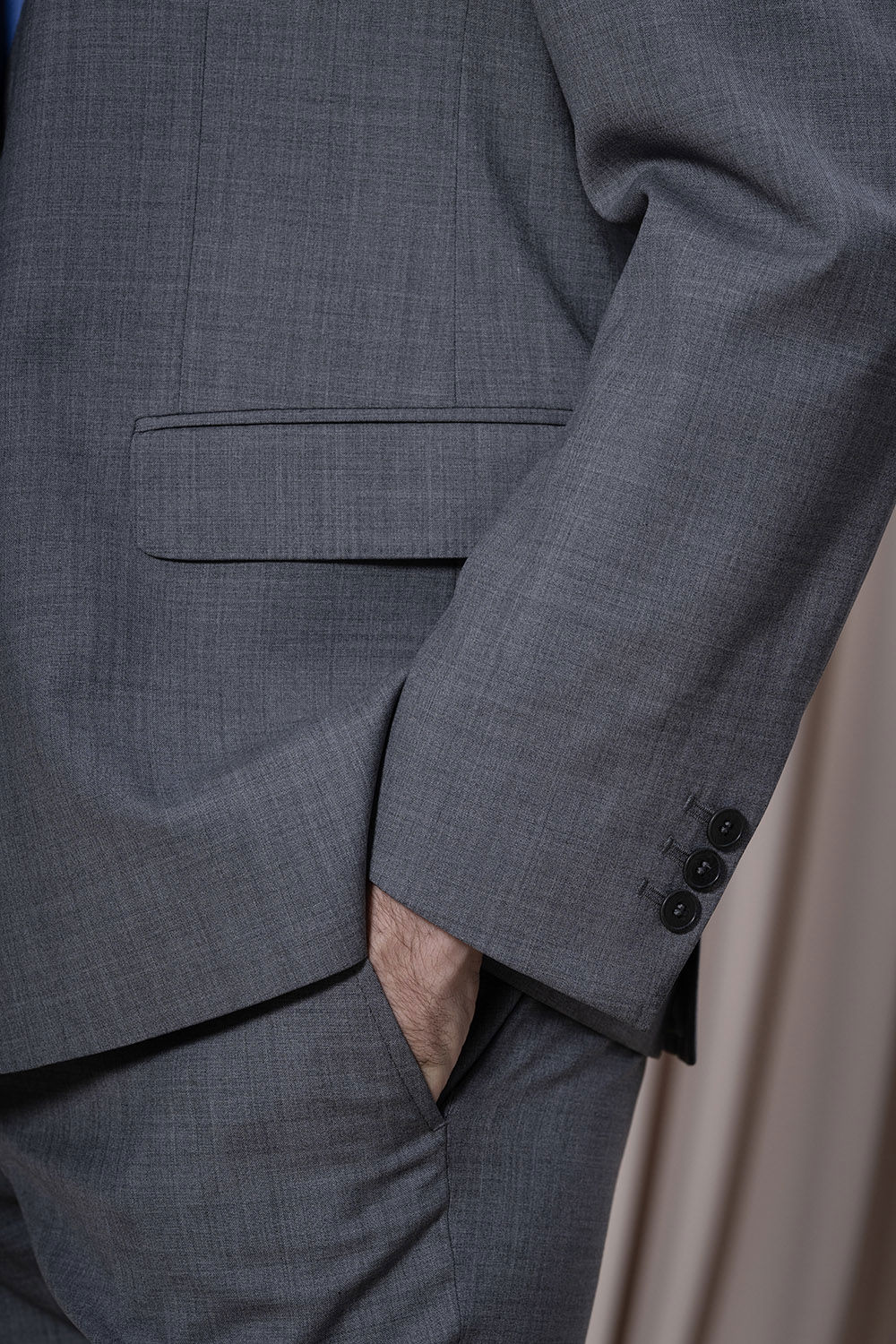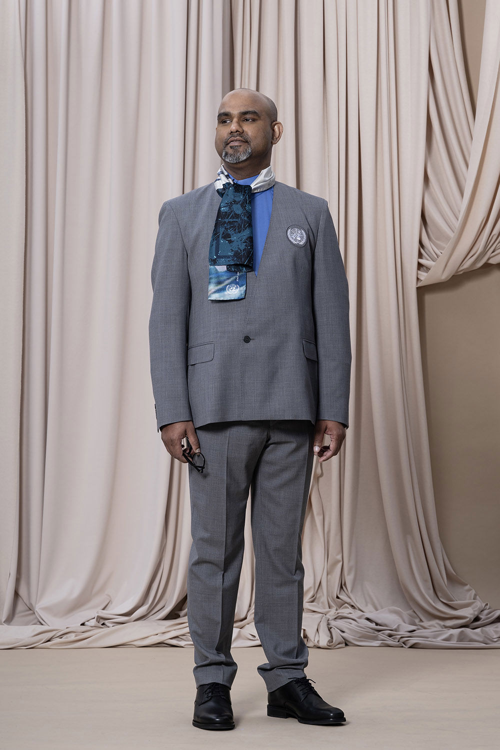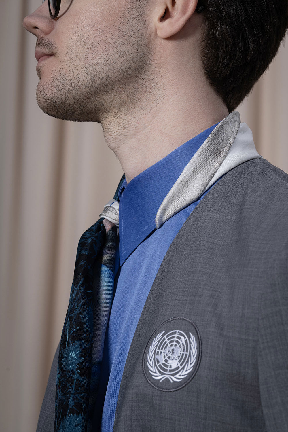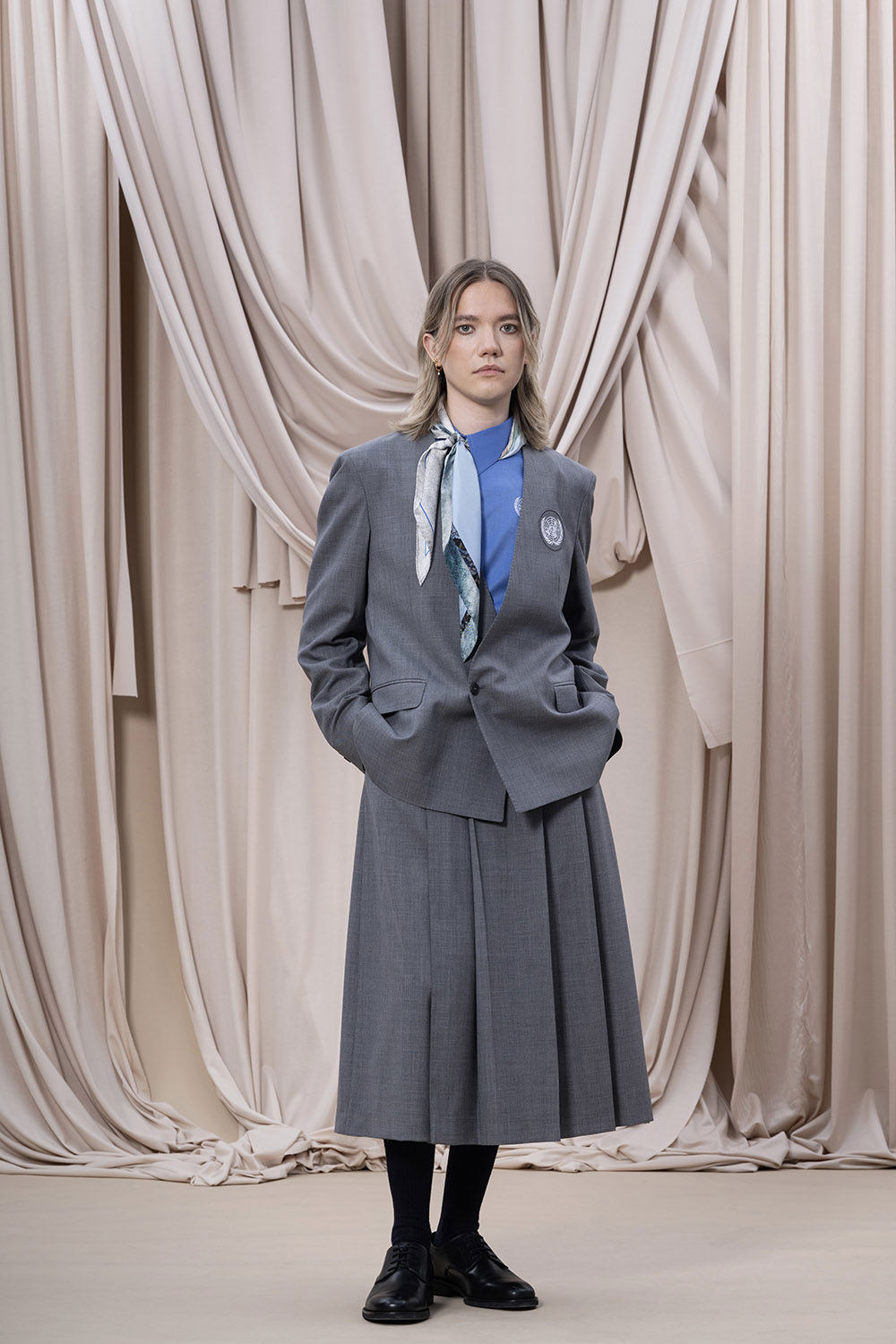 Dam- och herrplaggen har olika passform men samma uttryck för att åstadkomma en enhetlig look. Kavajen ger utrymme för rörelse. Kavajen är dubbelknäppt med en synlig och en dold knapp, samt en mjuk axelkonstruktion för ökad komfort.