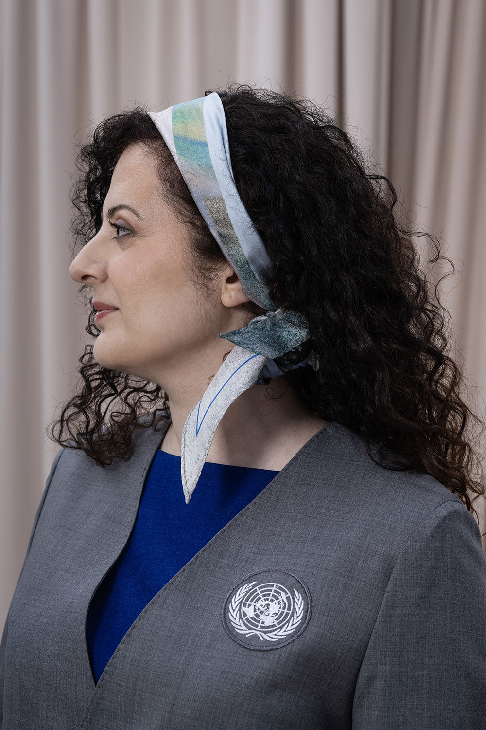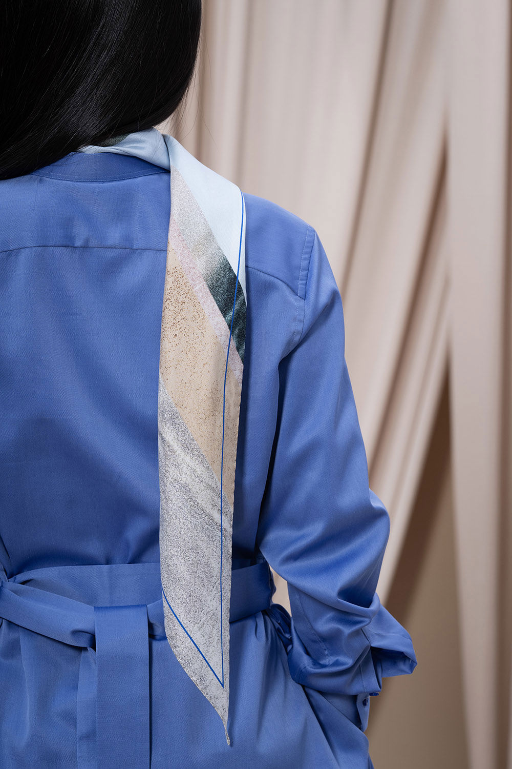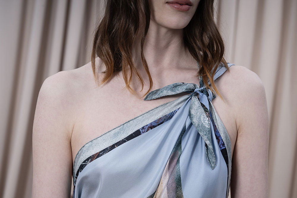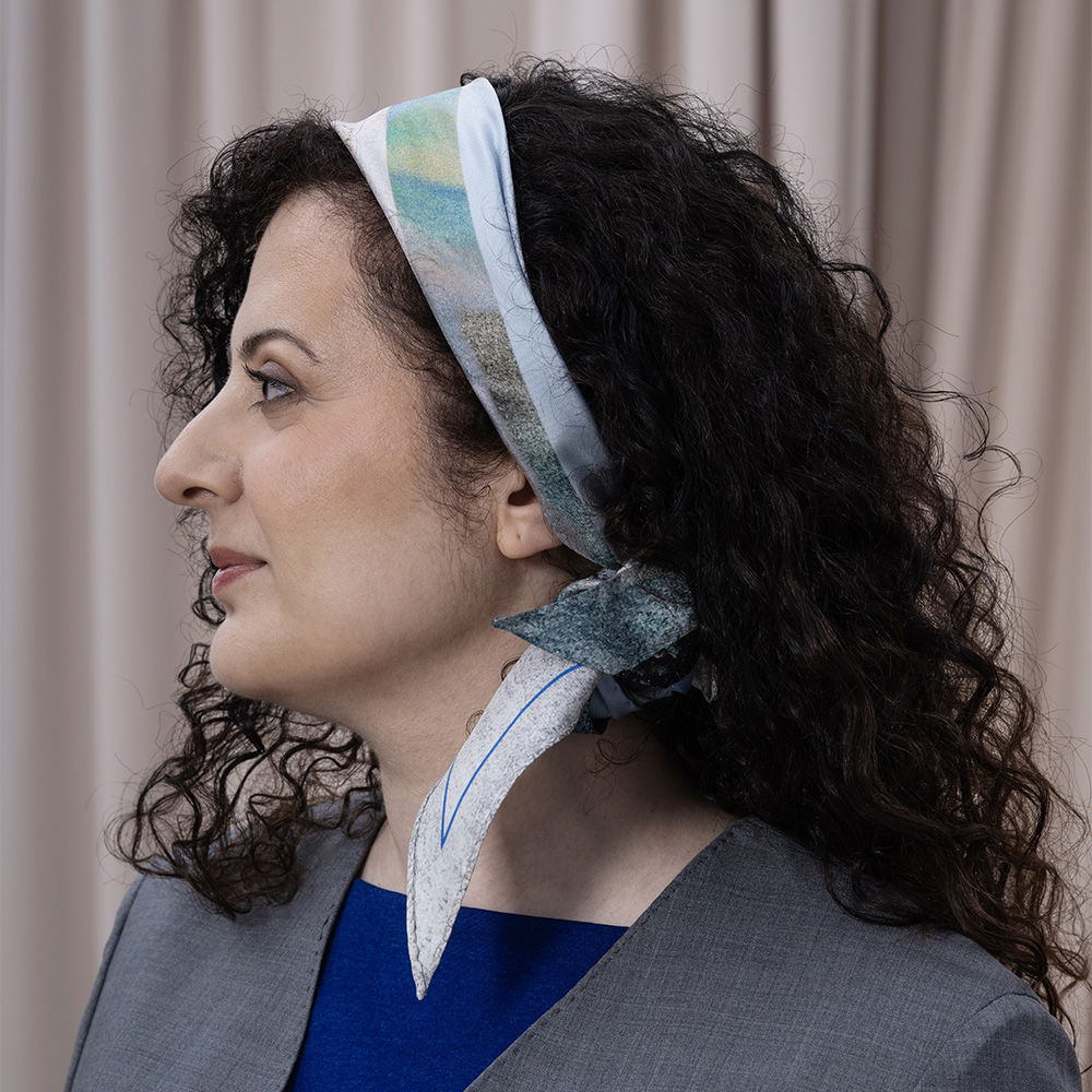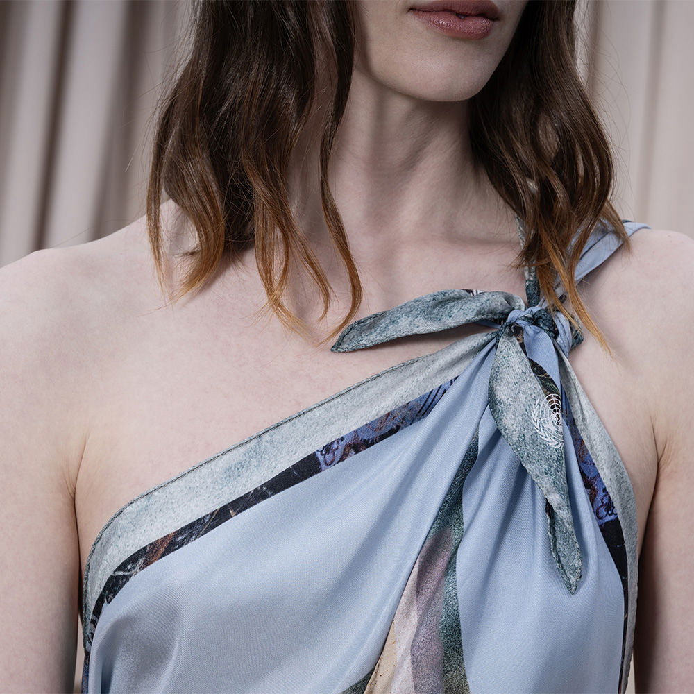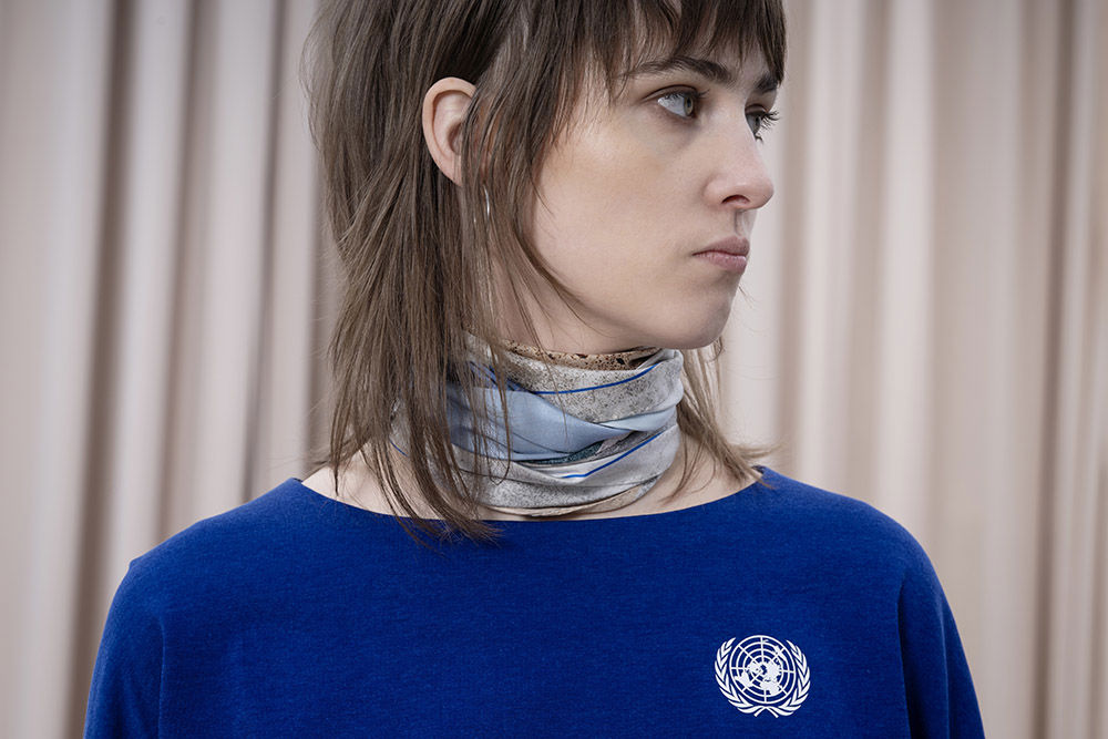 En scarf som fångar naturens skiftningar runt Backåkra och detaljer från FN:s högkvarter i New York. Mönstret, ett kollage av texturer och bildfragment, speglar allt från entréhallens arkitektur till den symboliska fredsrosen. Två linjer i vibrerande blå accentuerar kanten. Scarfen bär ett citat från generalsekreteraren António Guterres: ”Unite for people, unite for our planet, and unite for peace”, handskrivet av en student i designteamet. Asymmetrin i designen avspeglas i den unika rombformen. Scarfen är könsneutral och kan knytas på många sätt.