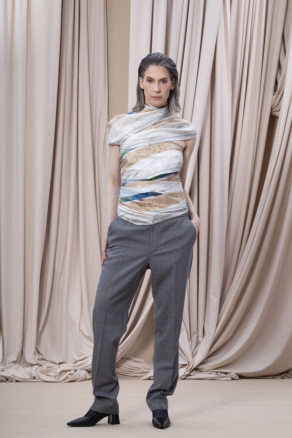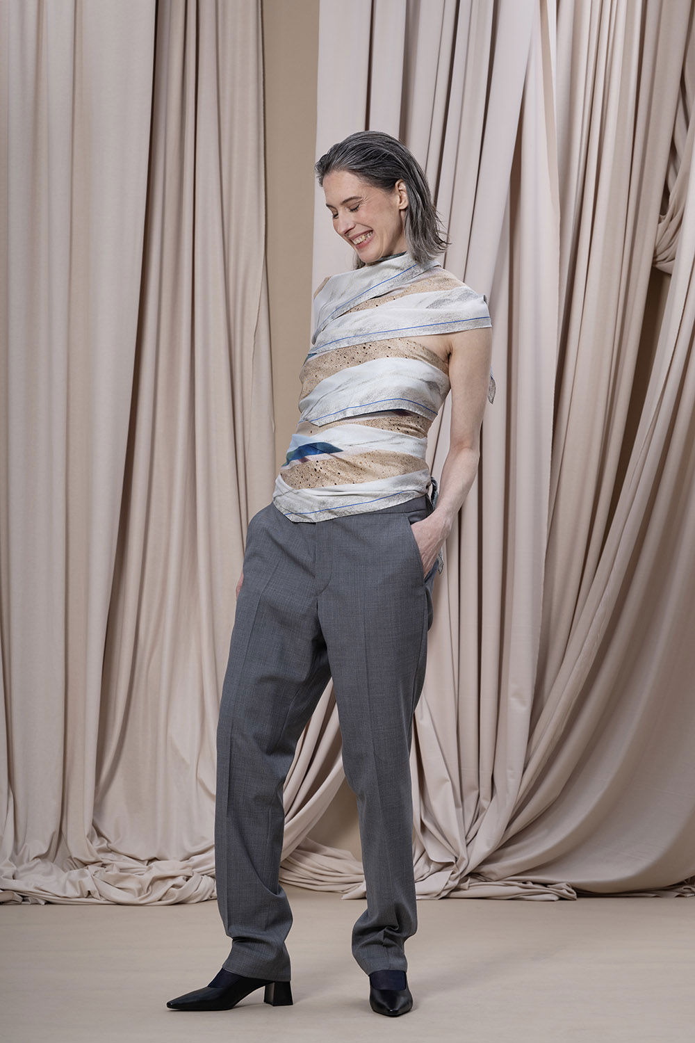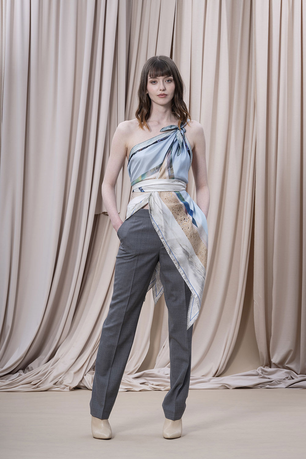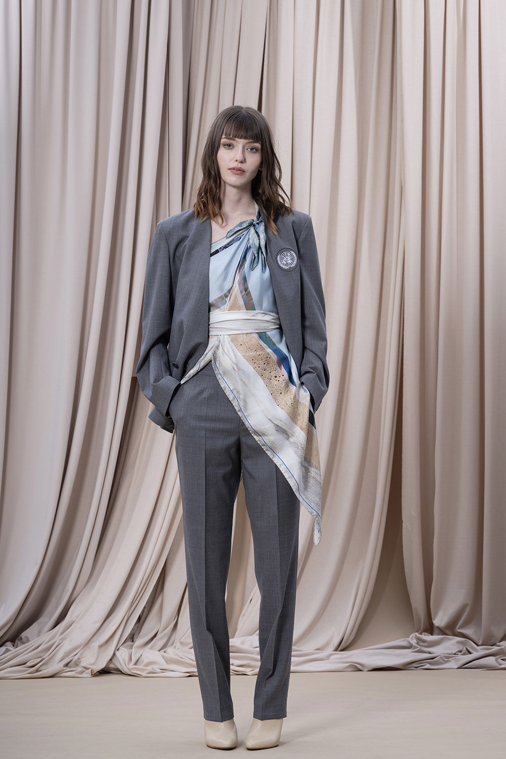 En scarf som fångar naturens skiftningar runt Backåkra och detaljer från FN:s högkvarter i New York. Mönstret, ett kollage av texturer och bildfragment, speglar allt från entréhallens arkitektur till den symboliska fredsrosen. Två linjer i vibrerande blå accentuerar kanten. Scarfen bär ett citat från generalsekreteraren António Guterres: ”Unite for people, unite for our planet, and unite for peace”, handskrivet av en student i designteamet. Asymmetrin i designen avspeglas i den unika rombformen. Scarfen är könsneutral och kan knytas på många sätt.